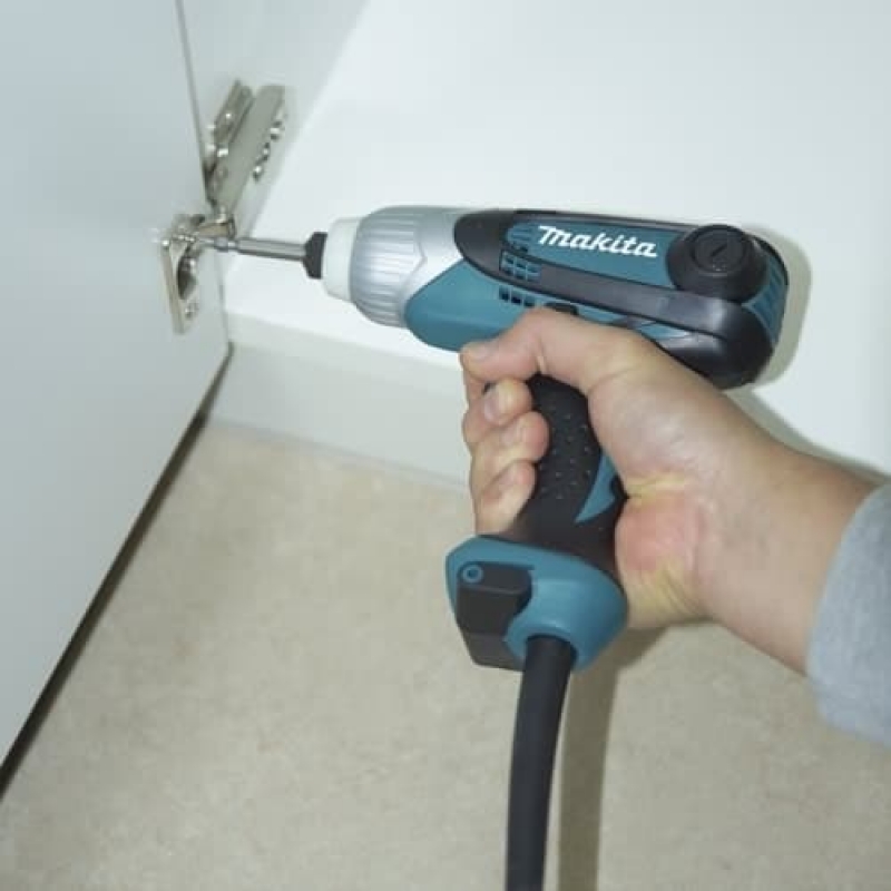 Управление шуруповертом Makita TD0101 не представляет никакой сложности и осуществляется посредством двух кнопок: пускового выключателя и переключателя реверса. Количество оборотов рабочего вала может быть задано в диапазоне от 0 до 3200 об/мин и регулируется автоматически, находясь в прямой зависимости от силы надавливания на пусковую клавишу в ходе работы.