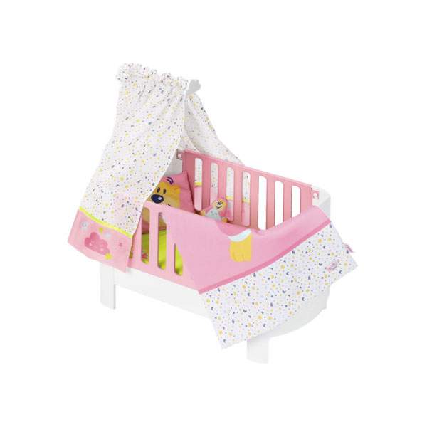 - Состав набора кроватка; балдахин; наволочка; простынка; пододеяльник; мягкая игрушка