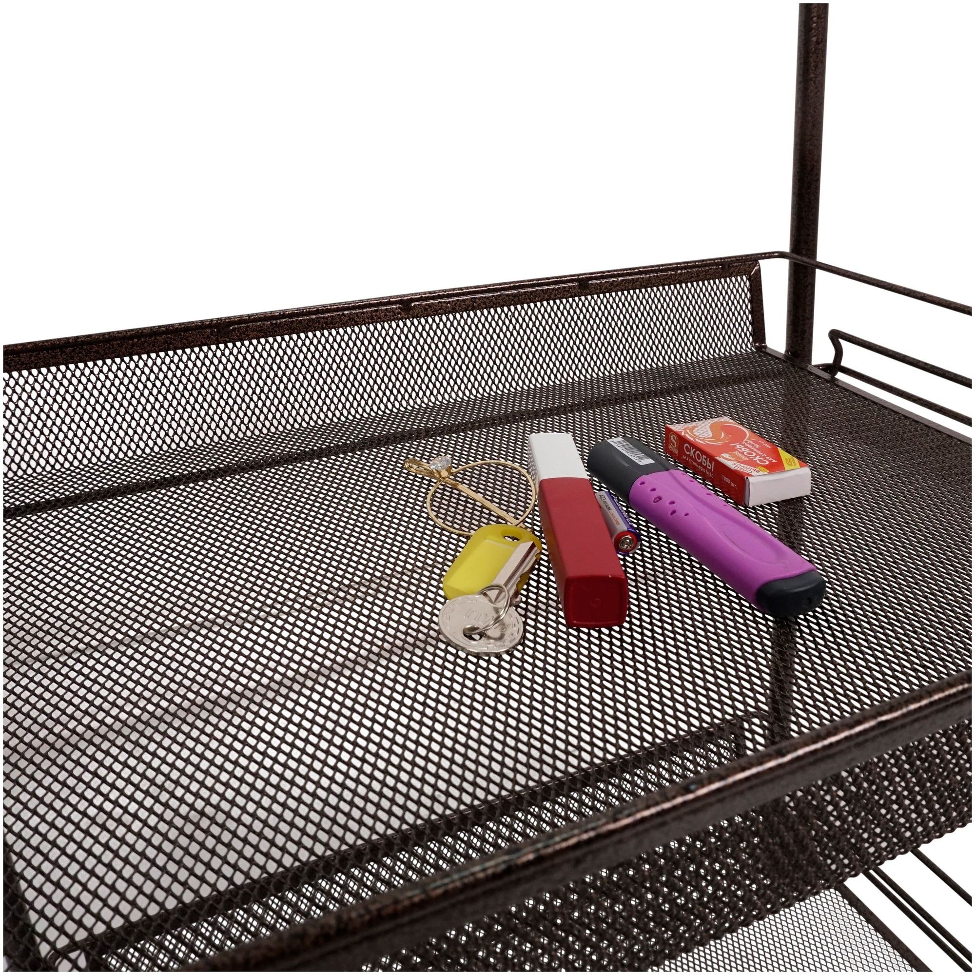 Сборно-разборная конструкция. Сборка без инструментов. 2 широкие корзины. Удобный металлический столик. Увеличенное расстояние между нижними корзинами для высоких предметов. Пластиковые колеса для мобильности. Пластиковый крючок для мелочей. Допустимая нагрузка до 10 кг на корзину