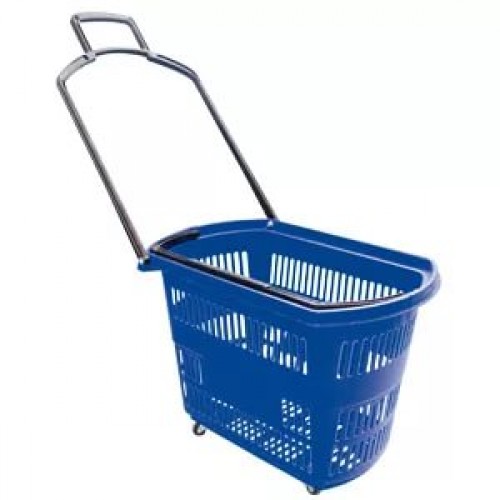 Пластиковая корзина-тележка увеличенного объема на 4х поворотных колесах. Складная ручка позволяет легко перемещать ее по торговому залу. Вторая ручка обеспечивает легкость переноски и штабелирования. Объём: 45 л. Цвет: синий.