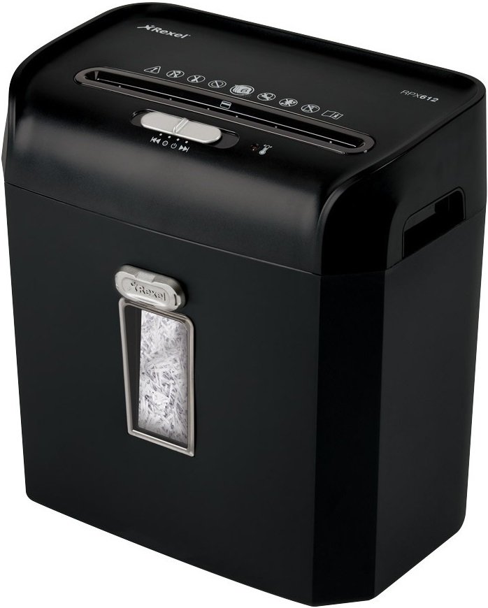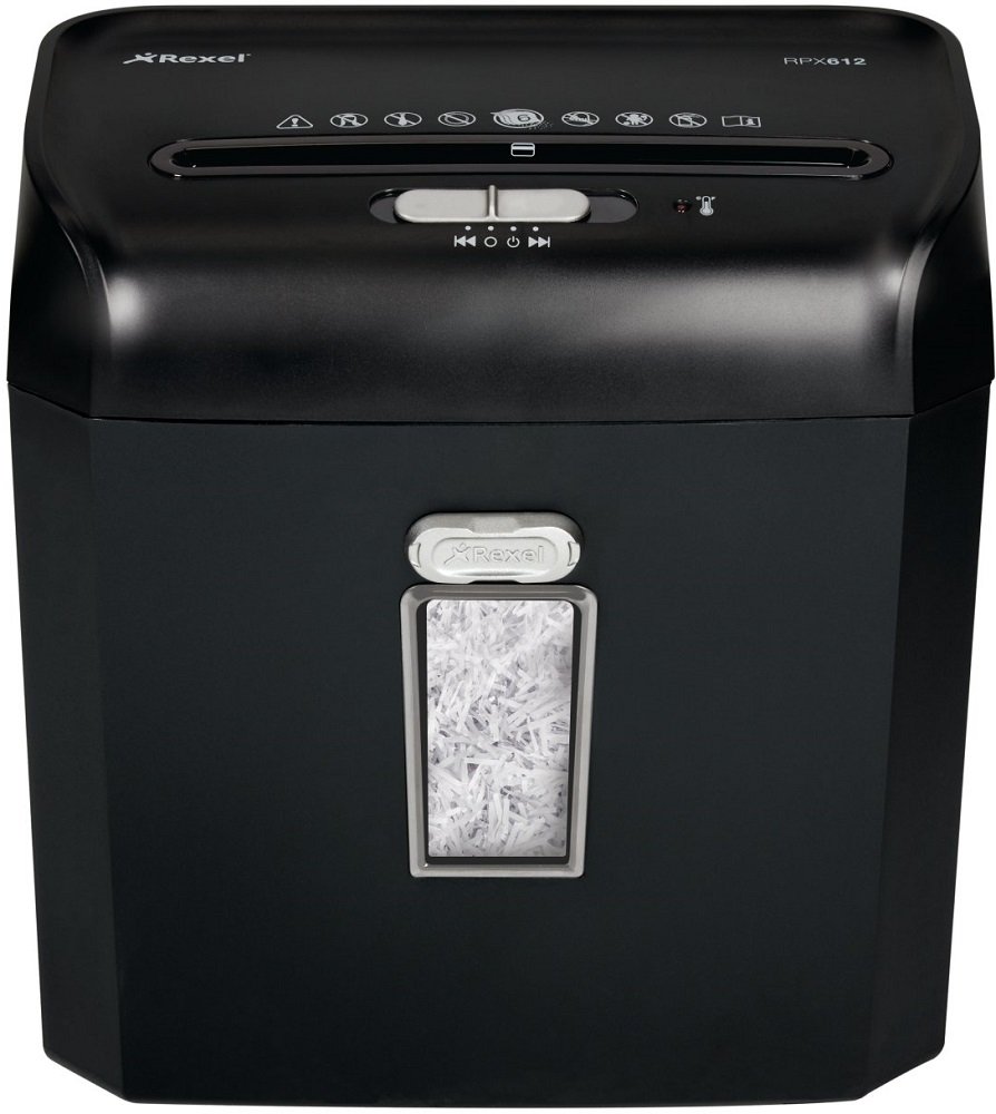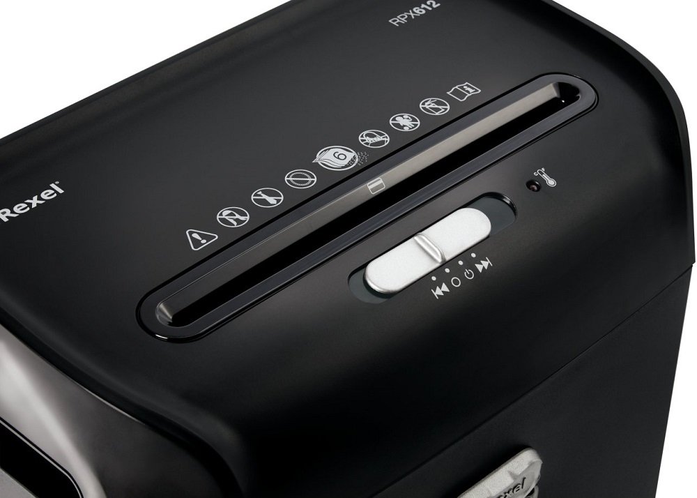 Перекрестная резка; 4 уровень секретности; уничтожение: скобы, пластиковые карты, скрепки; шум 55 дБ; корзина 12 л.