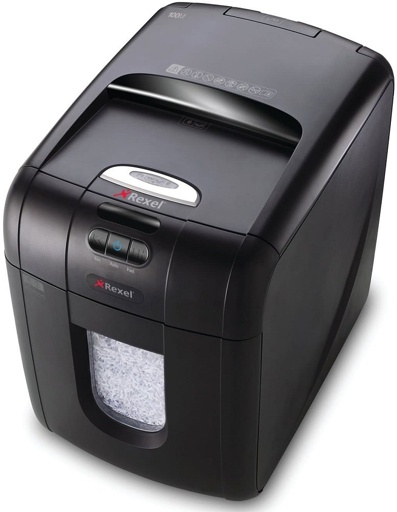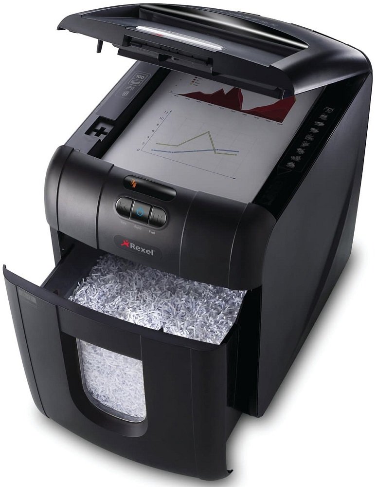 Перекрестная резка; 5 уровень секретности; уничтожение: скобы, пластиковые карты, скрепки; шум 60 дБ; реверс; корзина 26 л.