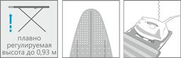 - Дополнительно Удлиннитель электросети; Подставка для утюга; Подставка для рукавов; Кронштейн для развешивания рубашек; Полка для белья; Держатель шнура утюга; Розетка с удлинителем
