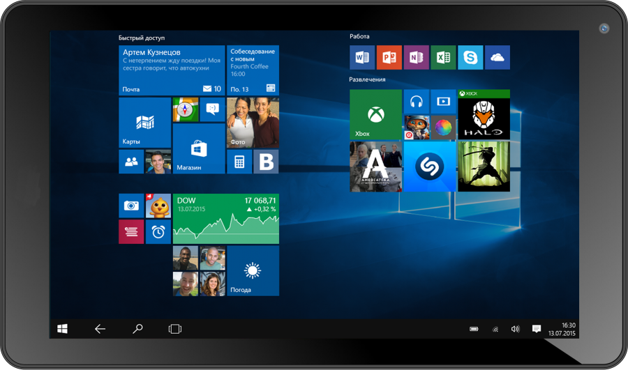 8.9 "; TN+Film; 1024х600; Windows; Intel Atom Z3735G; 4 ядерный; ОЗУ 1 Гб; встроенная память 16 Гб; тыловая камера - 2 Мп; Wi-Fi, Bluetooth; вес 480 г.
