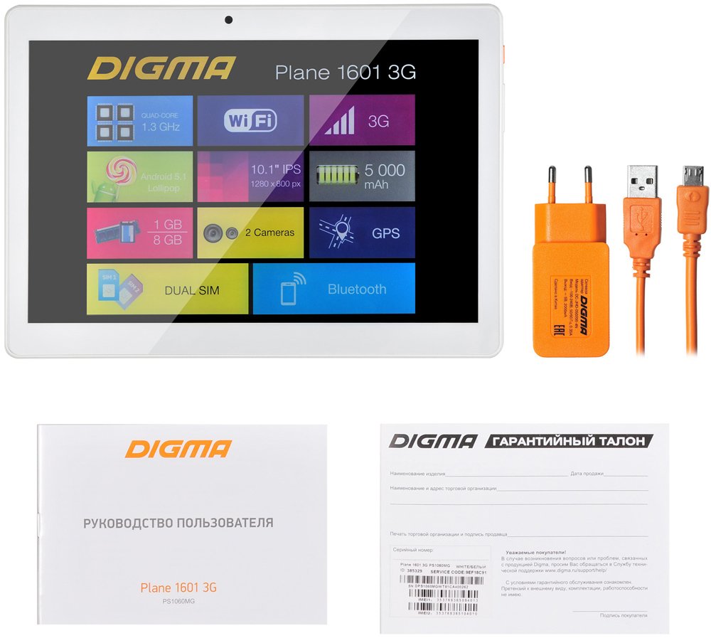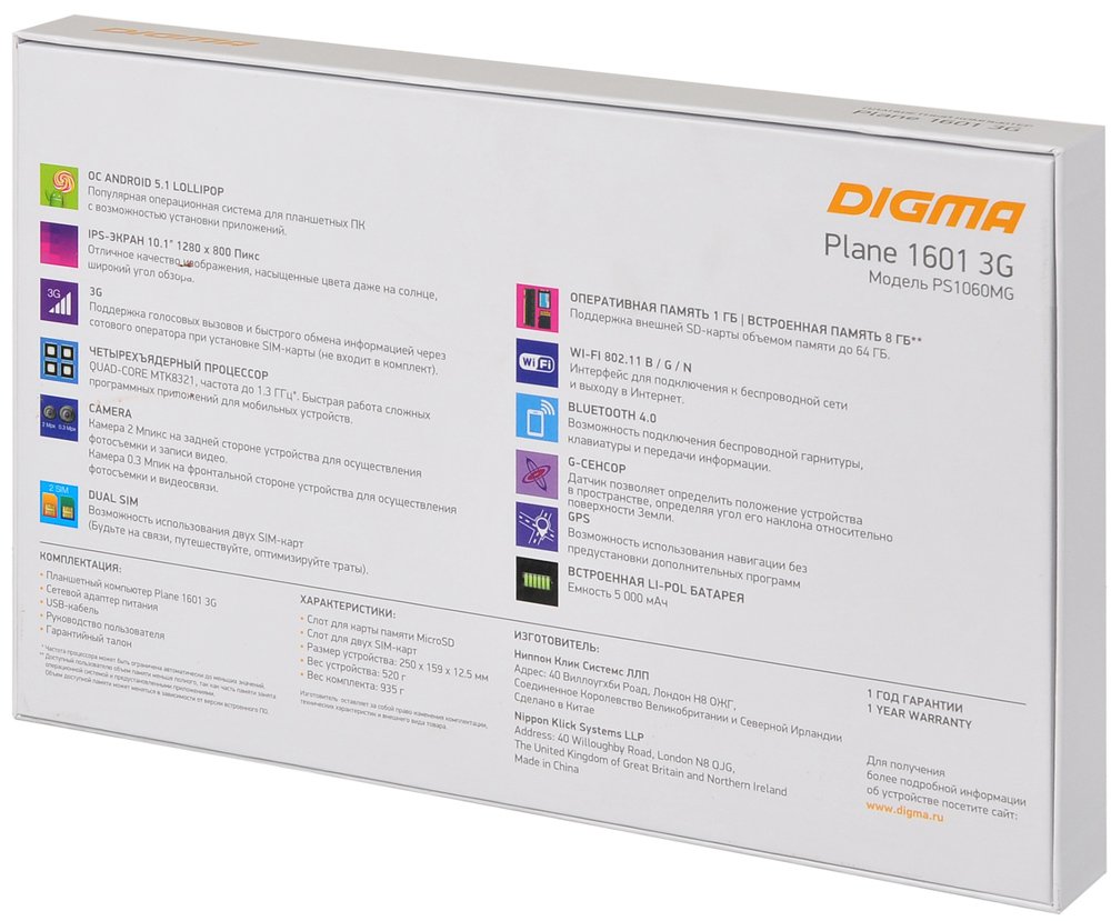 10.1 "; IPS; 1280x800; Android; MediaTek MT8321; 4 ядерный; ОЗУ 1 Гб; встроенная память 8 Гб; тыловая камера - 2 Мп; Bluetooth, Wi-Fi, 3G; вес 520 г.