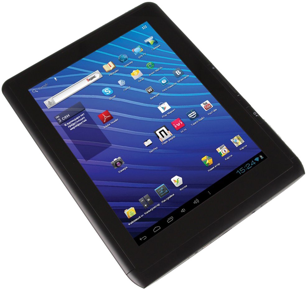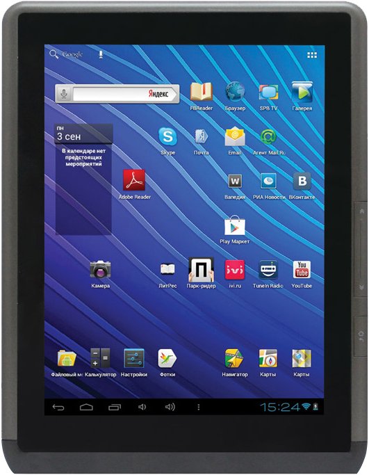 8 "; TN+Film; 800x600; Android; Allwinner A13; 1 ядерный; ОЗУ 512 Мб; встроенная память 4 Гб; Wi-Fi; вес 440 г.