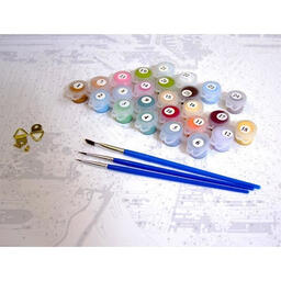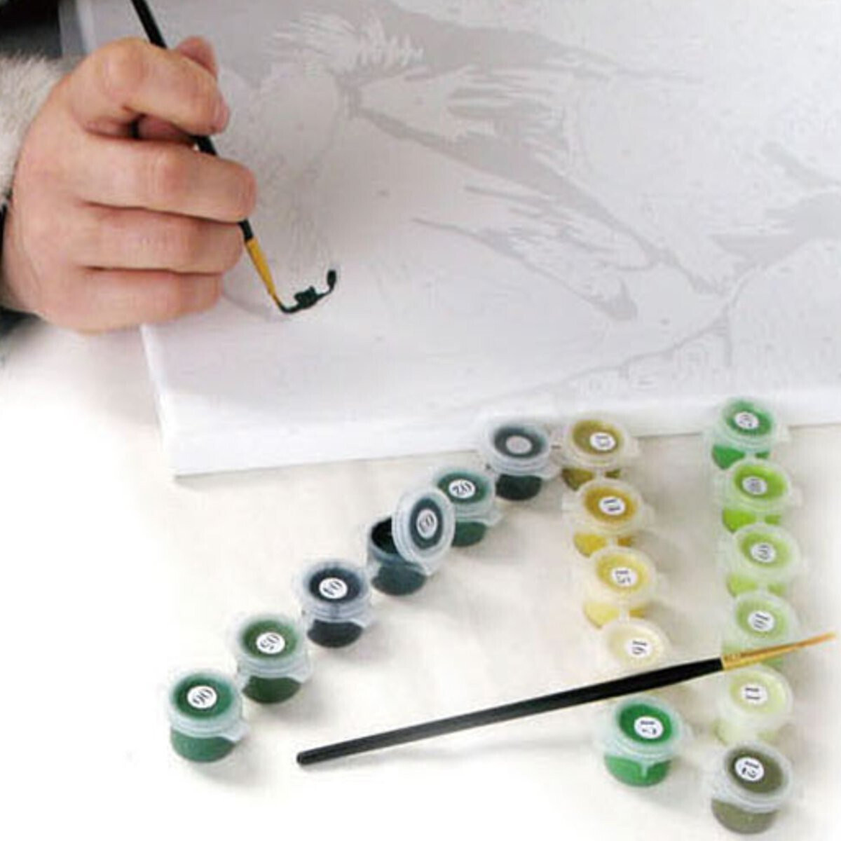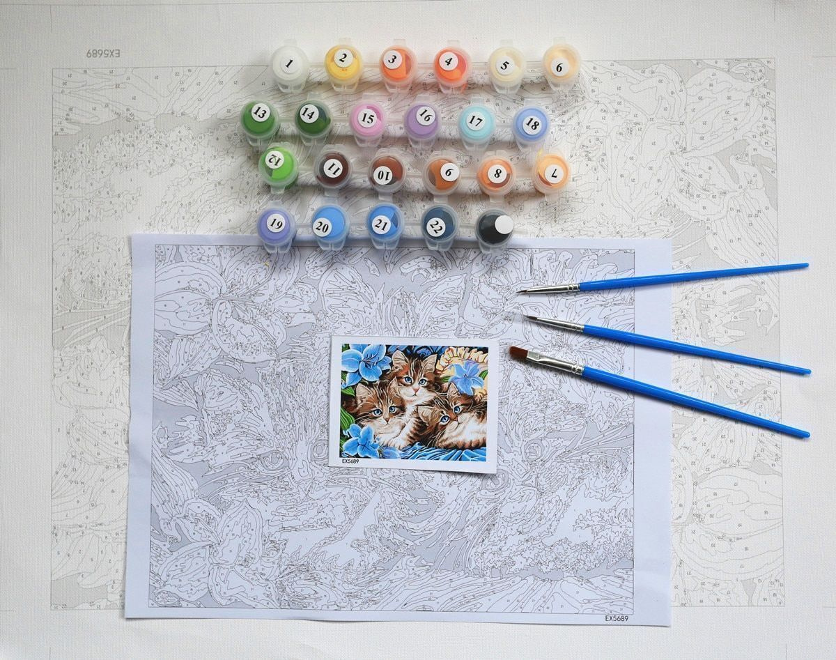 - Состав комплекта Холст на подрамнике, Набор красок, Кисть, Пробный лист с рисунком, Настенное крепление для картины