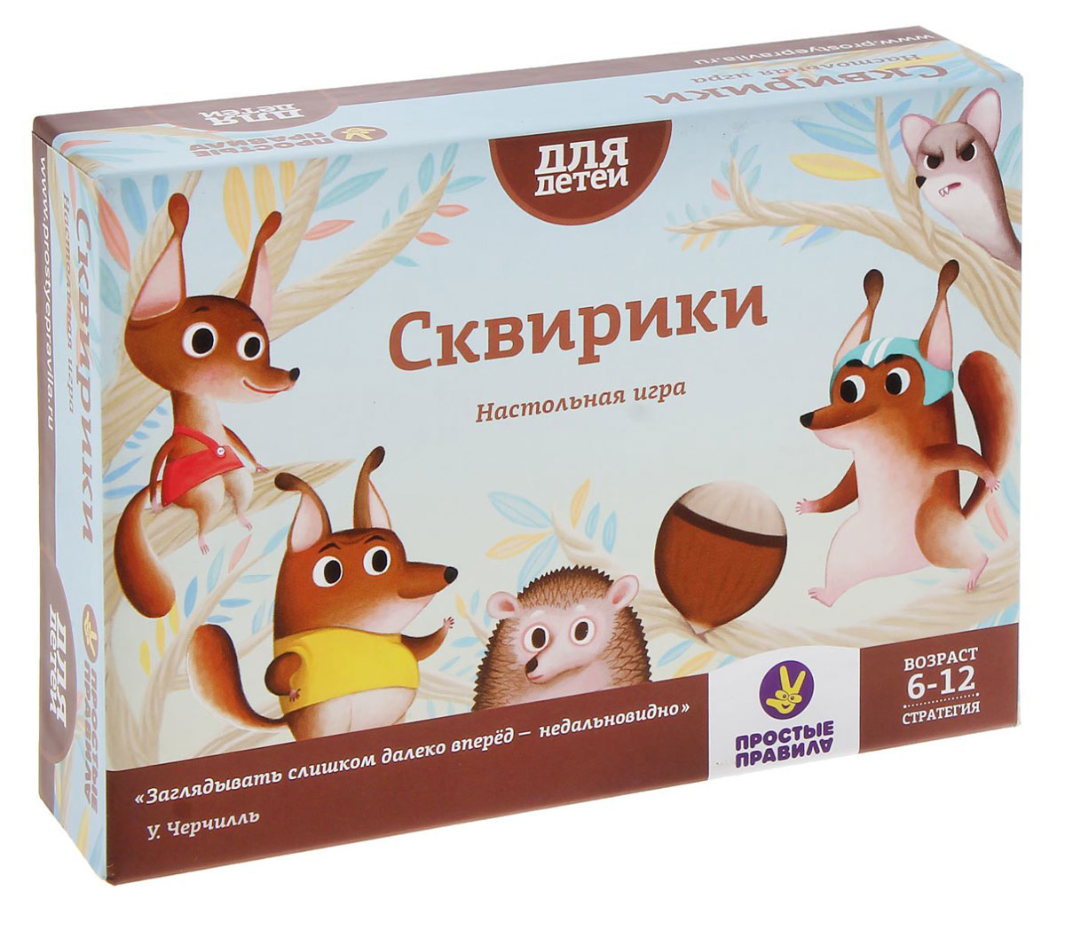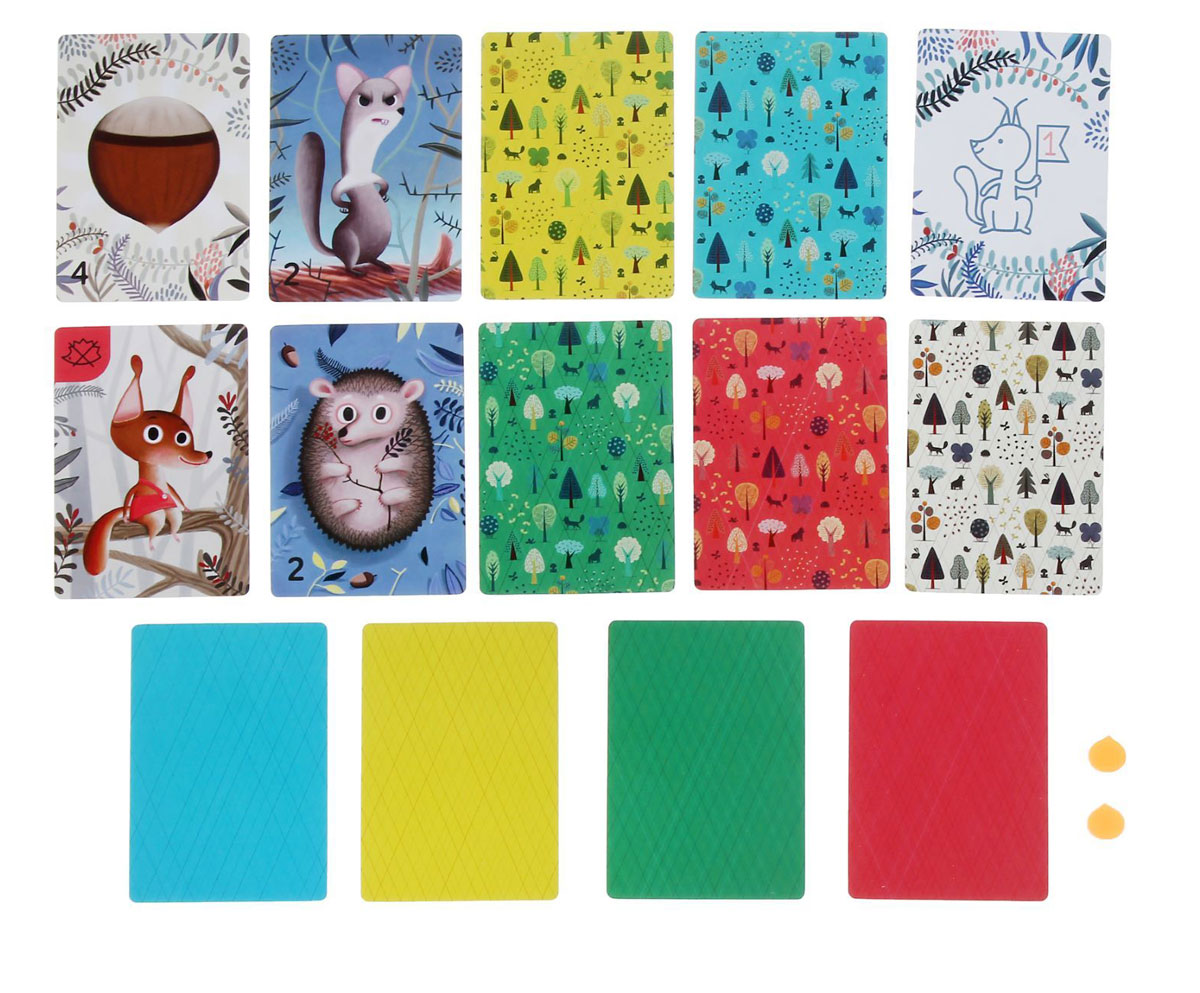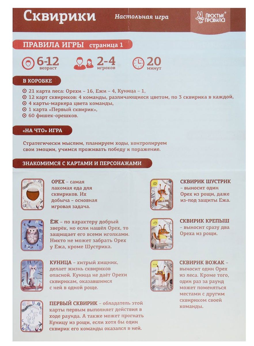 - Комплектация 21 карта леса, 12 карт сквириков, 4 карты-маркера цвета команды, карта "Первый сквирик", 60 фишек-орешков