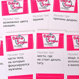 Комплектация:Коробка, игровое поле - 1 шт., карты с вопросами - 300 шт., карты передачи вопроса - 12 шт., карты замены вопроса - 12 шт., фишки игроков - 6 шт., коробочка для карт - 1 шт., пятисекундный таймер-спираль - 1 шт., правила игры.
