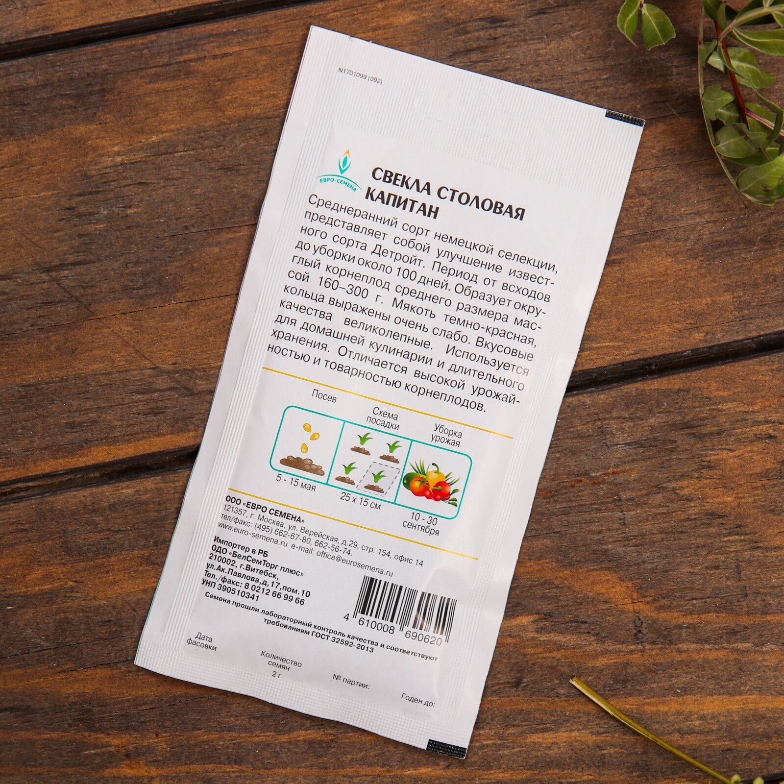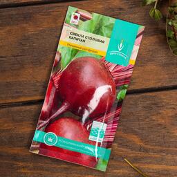 Семена «Свёкла Капитан», 2 г — среднеранний сорт немецкой селекции, представляет собой улучшение известного сорта «Детройт». Период от всходов до уборки — около 100 дней. Образует округлый корнеплод среднего размера массой 160–300 г. Мякоть тёмно-красная, кольца выражены очень слабо. Вкусовые качества великолепные.