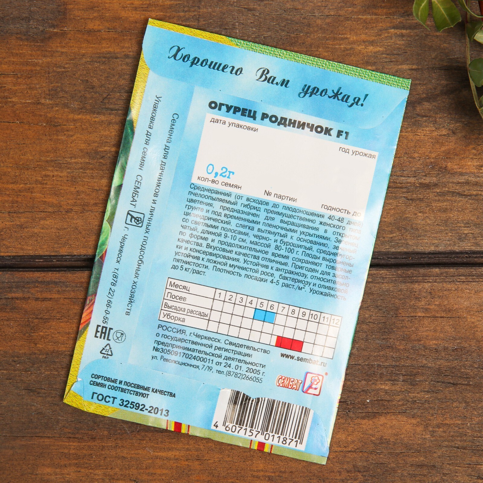 Огурец Родничок F1 – среднеранний (от всходов до плодоношения 40-48 дней) плечоопыляемый гибрид преимущественно женского типа цветения, предназначен для выращивания в открытом грунте и под временными пленочными укрытиями. Зеленец цилиндрицеский, слегка вытянутый к основанию, зеленый со светлыми полосами, черно- и бурошипый, среднебугорчатый, длиной 9-10 см, массой 80-100 г. Плоды выровнены по форме и продолжительное время сохраняют товарные качества. Вкусовые качества отличные. Пригоден для засолки и консервирования. Устойчив к антракнозу, относительно устойчив к ложной мучнистой росе, бактериозу и оливковой пятнистости. Плотность посадки 4-5 раст./м2. Урожайность до 5 кг/раст.