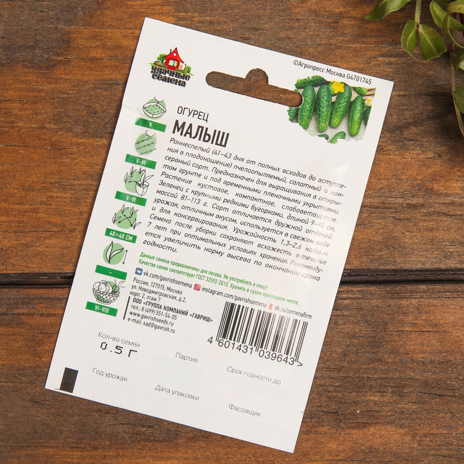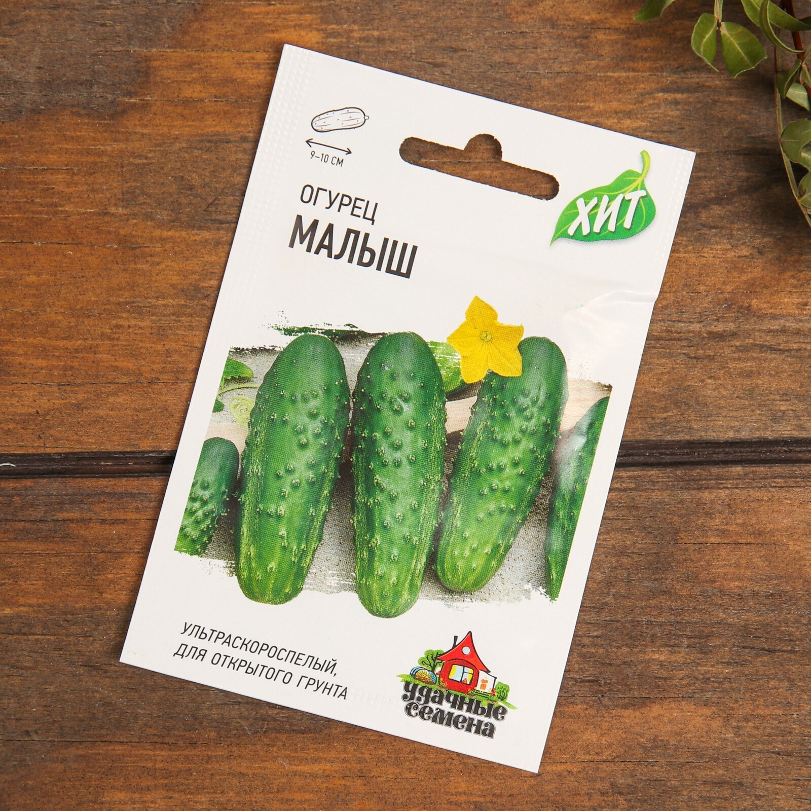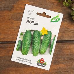 Огурец Малыш – раннеспелый (41-43 дня от полных всходов до вступления в плодоношение) пчелоопыляемый, салатный и консервный сорт. Предназначен для выращивания в открытом грунте и под временными пленочными укрытиями. Растение кустовое, компактное, слабоветвистое. Зеленец с крупными бугорками, длиной 9-10 см, массой 81-113 г. Сорт отличается дружной отдачей урожая., отличным вкусом, используется в свежем виде и для консервирования. Урожайность 1,3-2,6 кг/кв. м. Семена после уборки сохраняют всхожесть в течение 7 лет при оптимальных условиях хранения. Рекомендуется увеличивать норму посева по окончании срока годности.