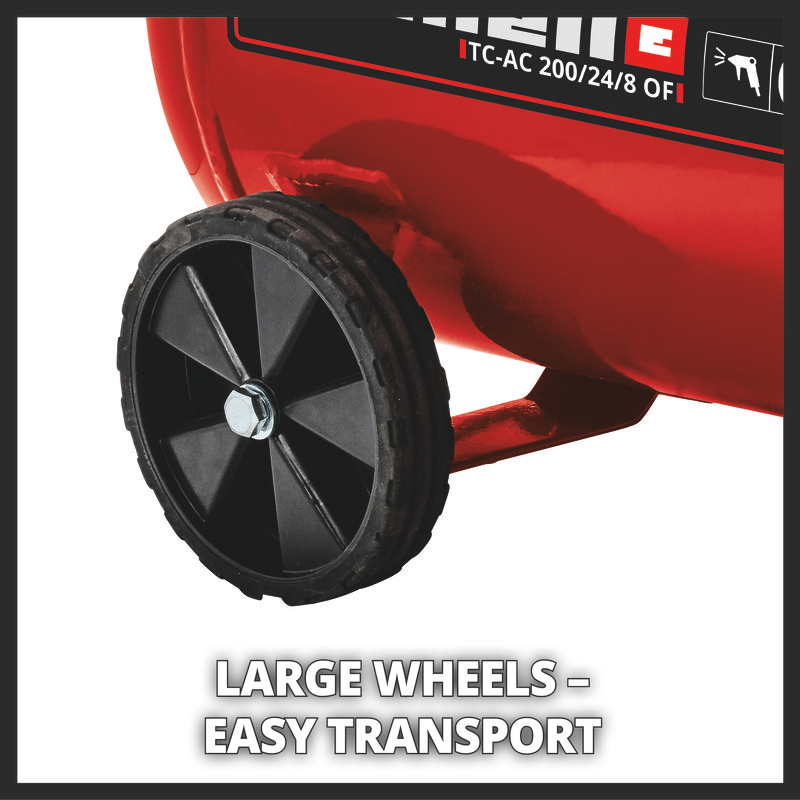 Компрессор Einhell TC-AC 200/24/8 OF является многофункциональным оборудованием, которое позволяет осуществлять использование пневмоинструмента вплоть до профессионального уровня. При скорости двигателя 15000 оборотов в минуту, компрессор обеспечивает мощность всасывания 180 л/мин и максимальное рабочее давление 8 бар. Компрессор работает от двигателя, не содержащего масла и не требующего обслуживания. 24-литровый бак обеспечивает достаточные запасы воздуха для многочисленных применений. Рабочее давление не более 8 бар может регулироваться редуктором, поэтому возможен целый ряд применений: нанесение лака и краски, надувание мячей и автомобильных шин, и др. Для регулируемого рабочего давления имеются манометр и быстроразъемная муфта. Для обеспечения безопасности используется обратный и предохранительный клапаны, а также дренажная пробка для слива конденсата, который собирается в баке. Надежное положение обеспечивается виброгасящей ножкой, а для легкой транспортировки имеются большие кол