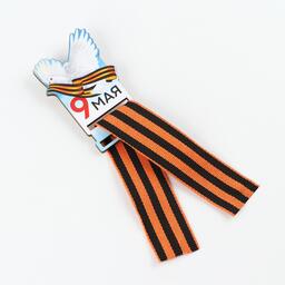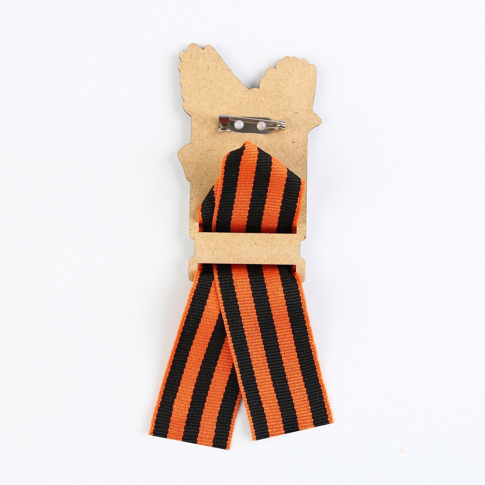 Георгиевская лента - главный атрибут и символ Дня Великой Победы. Ленточка дополнена деревянным значком-орденом с эксклюзивным дизайном. Изделие крепится с помощью булавки, которая идет в комплекте.