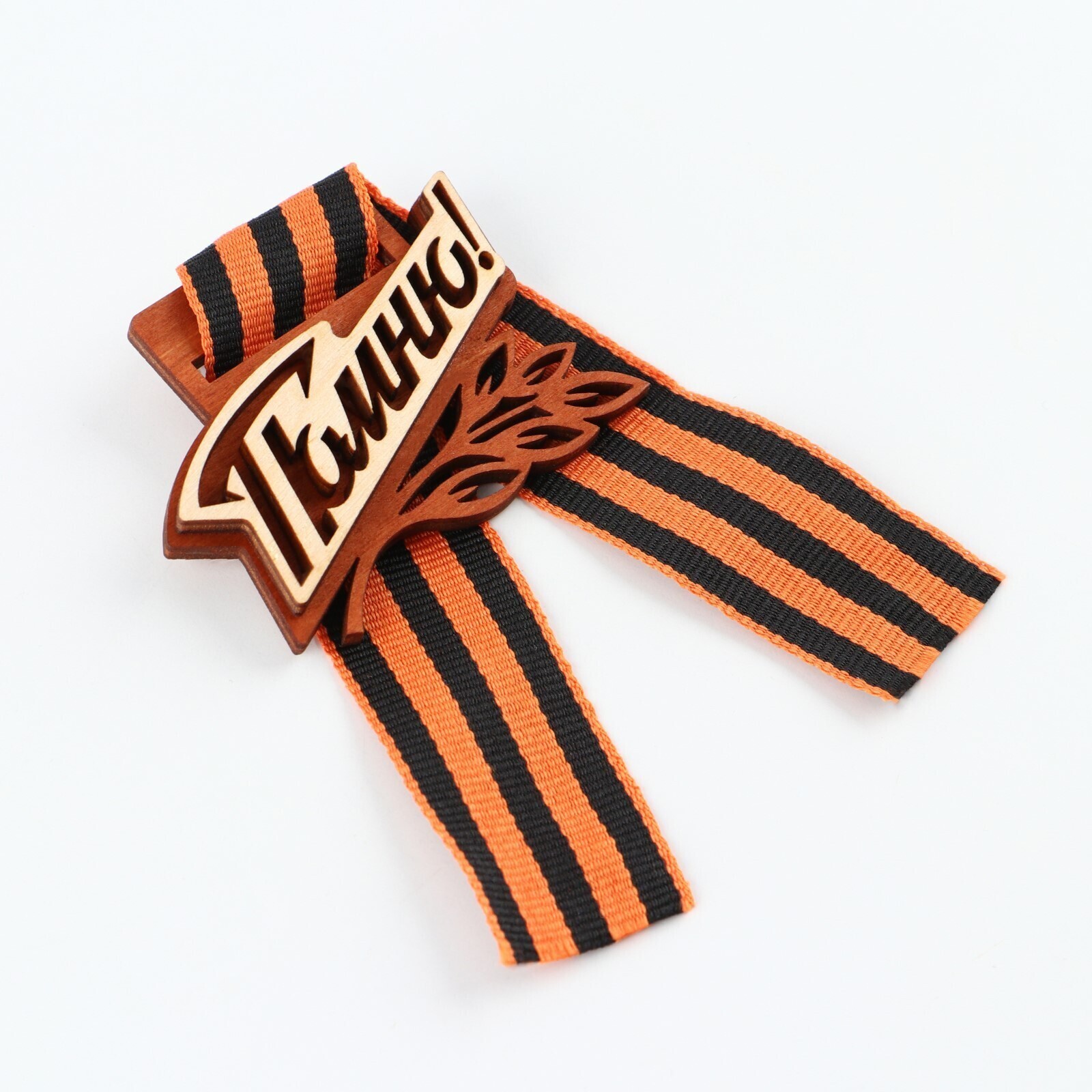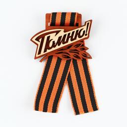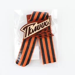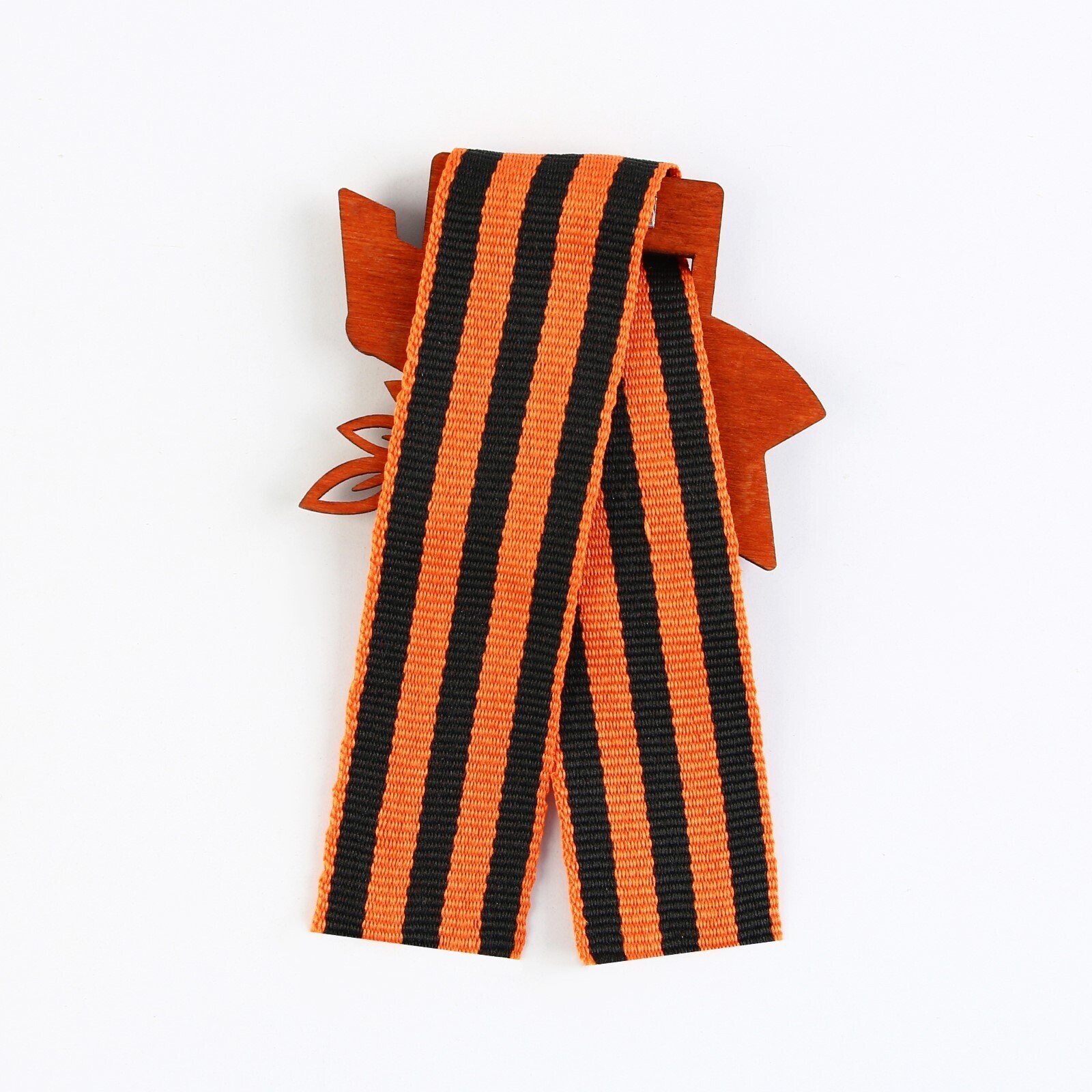 Георгиевская лента - главный атрибут и символ Дня Великой Победы. Ленточка дополнена деревянным значком-орденом с эксклюзивным дизайном. Изделие крепится с помощью булавки, которая идет в комплекте.