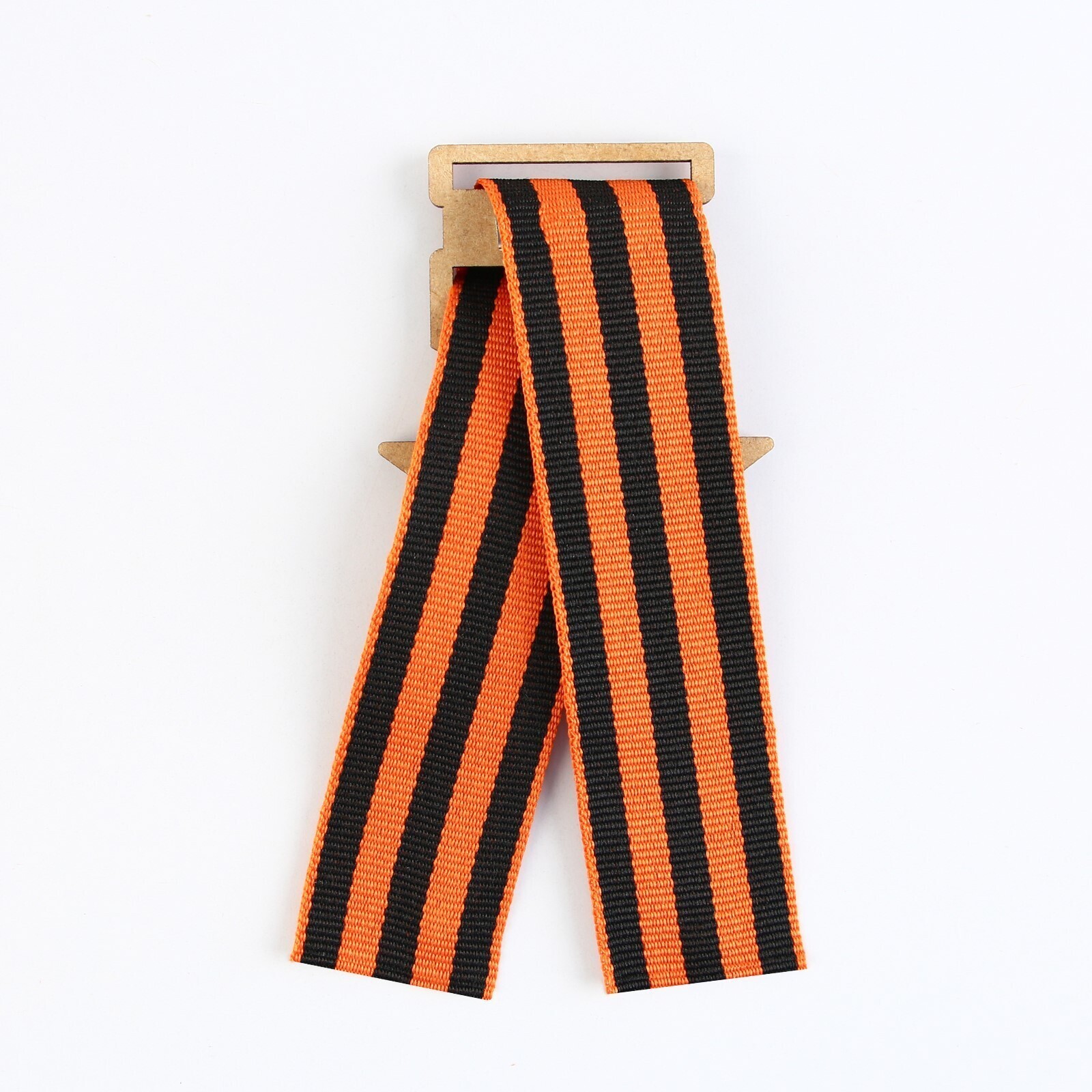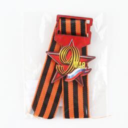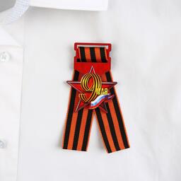 Георгиевская лента - главный атрибут и символ Дня Великой Победы. Ленточка дополнена деревянным значком-орденом с эксклюзивным дизайном. Изделие крепится с помощью булавки, которая идет в комплекте.