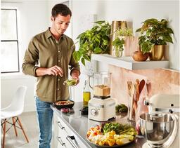 Стаціонарний блендер K400 створений для швидкого та ефективного подрібнення продуктів, дозволяючи готувати крем-суп, дитяче харчування, горіхову пасту, соус, пюре чи смузі за лічені секунди! Блендер оснащений трискладовою системою, яка працює в повній гармонії - це унікальний асиметричний ніж з нержавіючої сталі, чаша з ребристою поверхнею для постійного контакту з лезами, а також мотор Intelli-Speed потужністю 1,5 л. с., який розпізнає вміст чаші та підтримує оптимальну швидкість змішування.