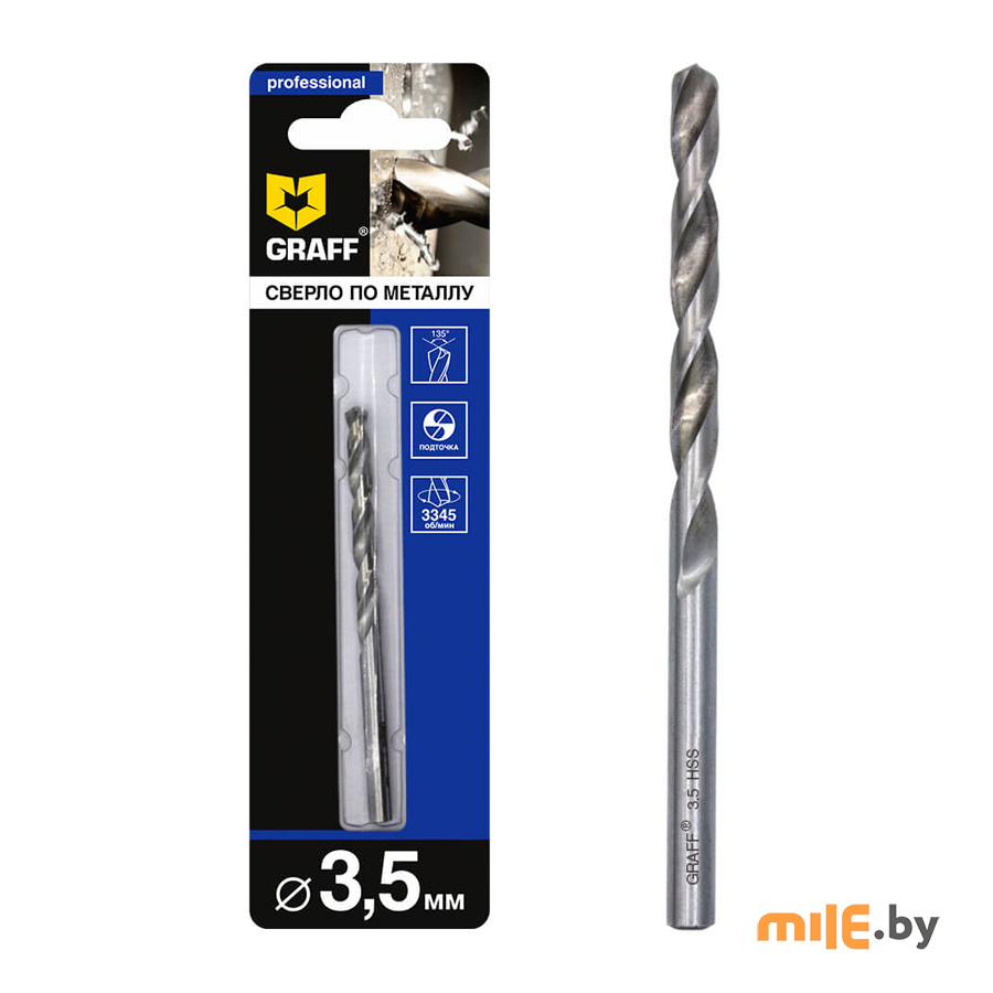 Сверла для точного сверления металла различной вязкости. Бренд GRAFF выпускает оснастку с размерами 3,5 мм под самозажимный или кулачковый патроны. Инструмент изготовлен из прочной стали марки HSS 4341, которая отлично справляется со многими типами металлов, обеспечивая высокий класс точности В1. Это сверло можно использовать для сверления отверстий без дополнительных операций, что обеспечивается крестовой подточкой и оптимальным углом заточки.