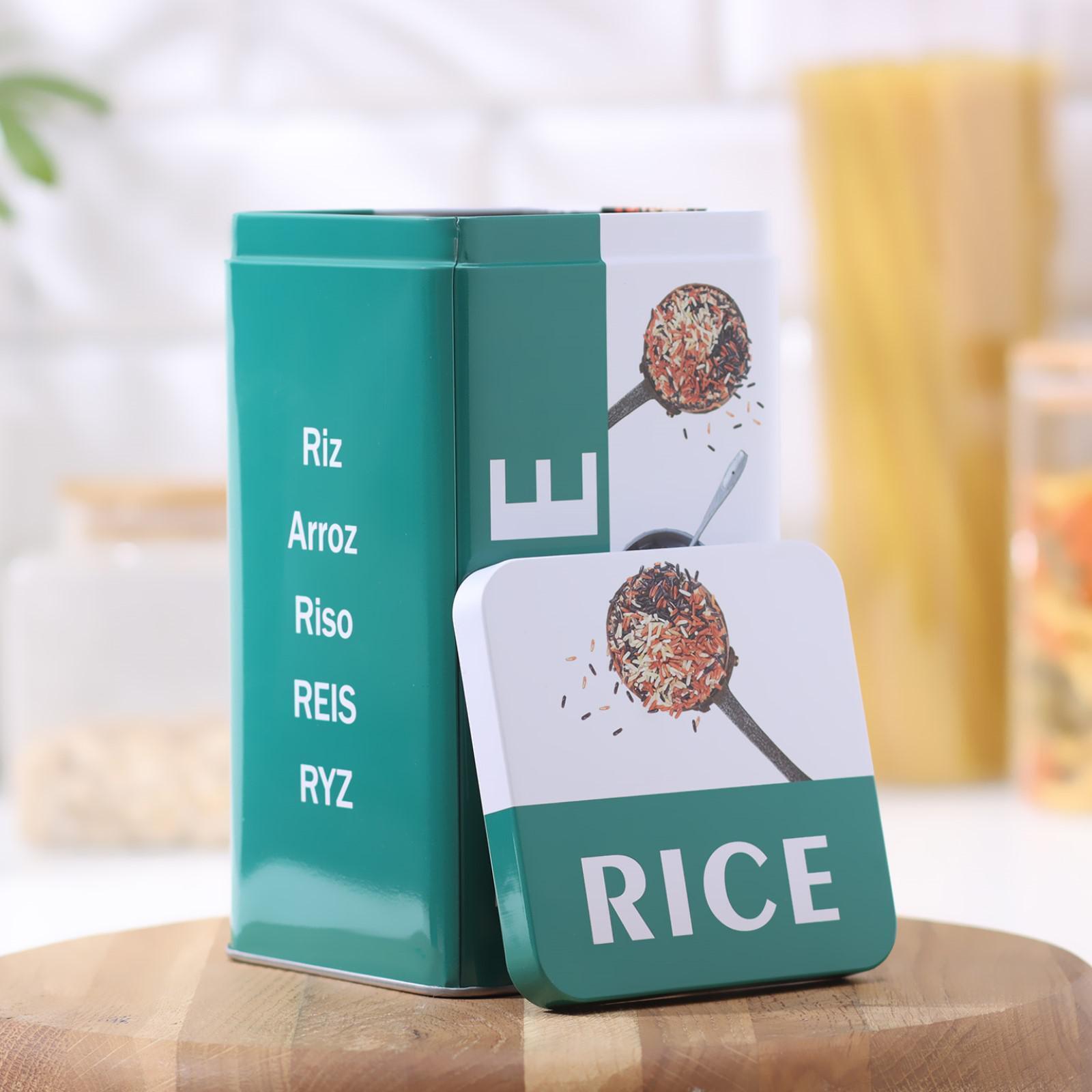Банка для сыпучих продуктов изготовлена из жести. Крышка плотно закрывается и защищает еду от излишней влаги и проникновения посторонних запахов.