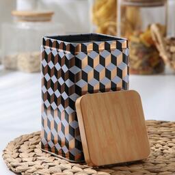 Банка для сыпучих продуктов изготовлена из жести. Крышка плотно закрывается и защищает еду от излишней влаги и проникновения посторонних запахов.