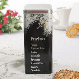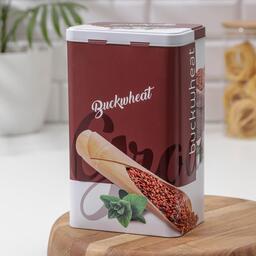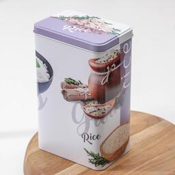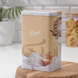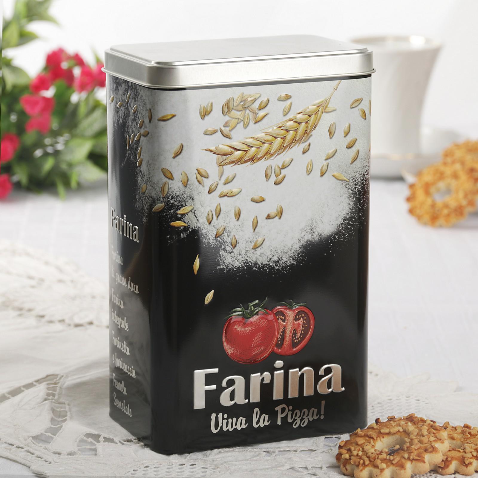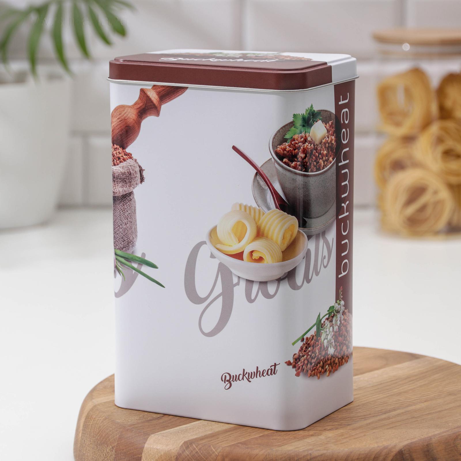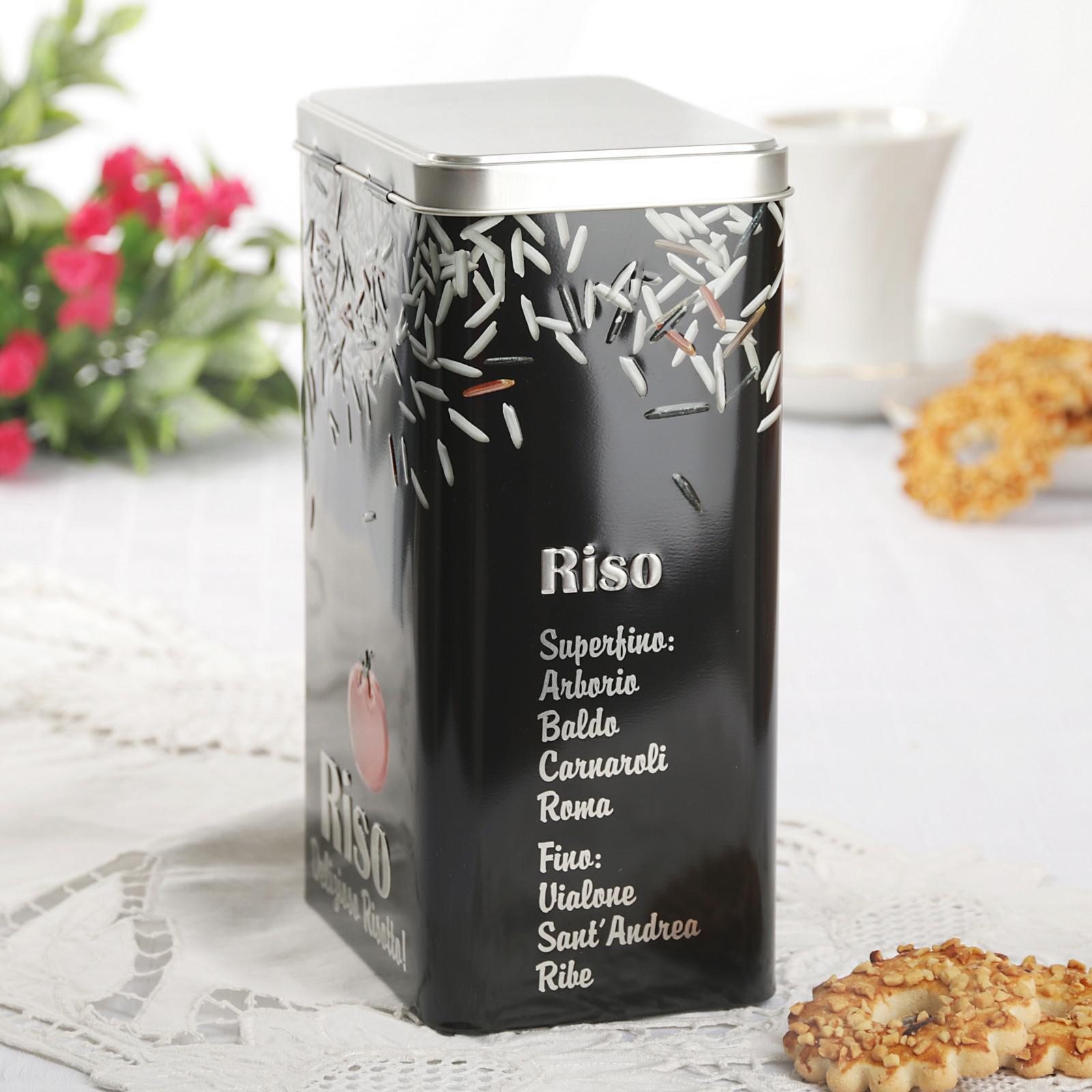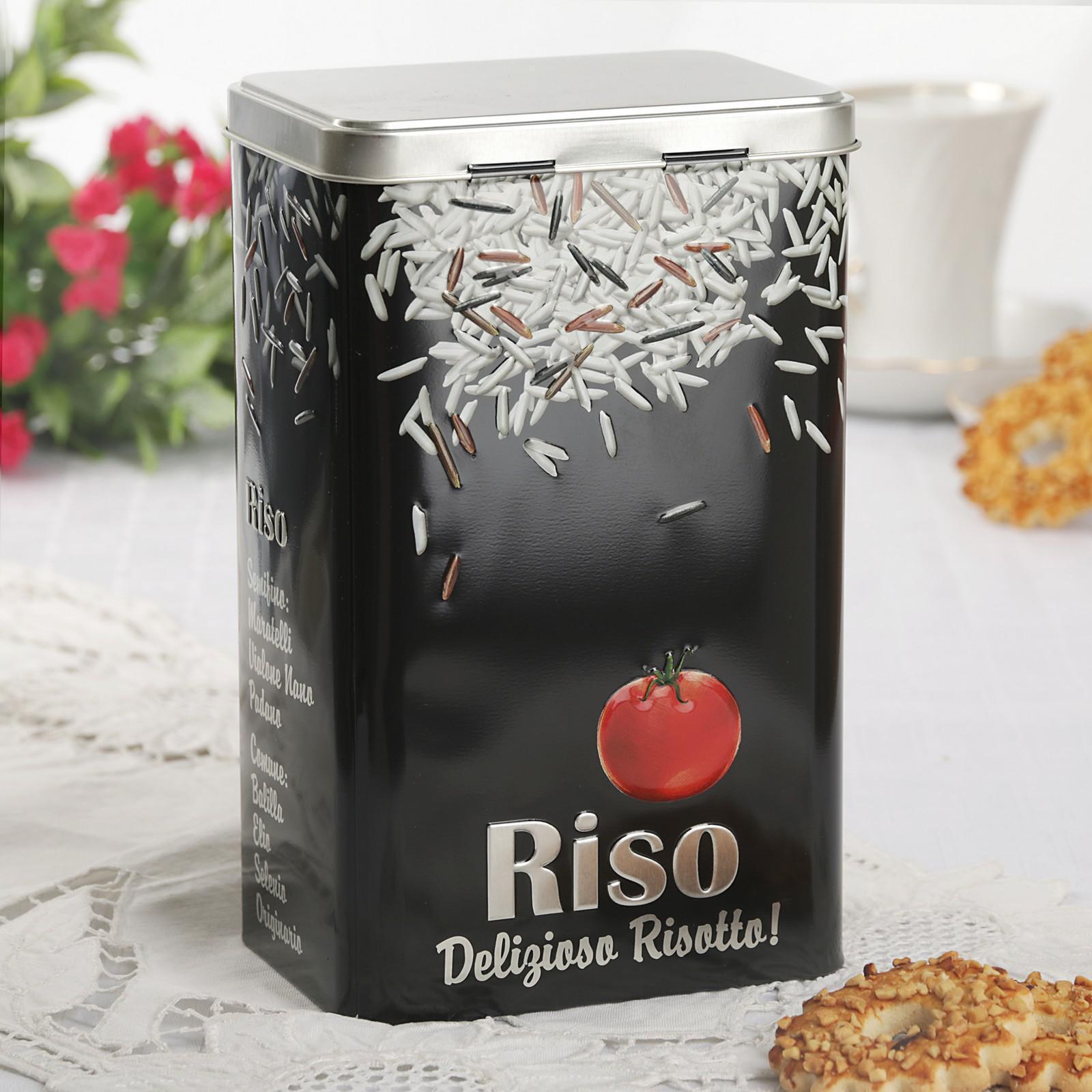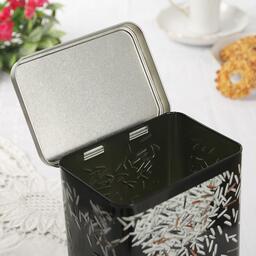Банка для сыпучих продуктов изготовлена из жести. Крышка плотно закрывается и защищает еду от излишней влаги и проникновения посторонних запахов.
