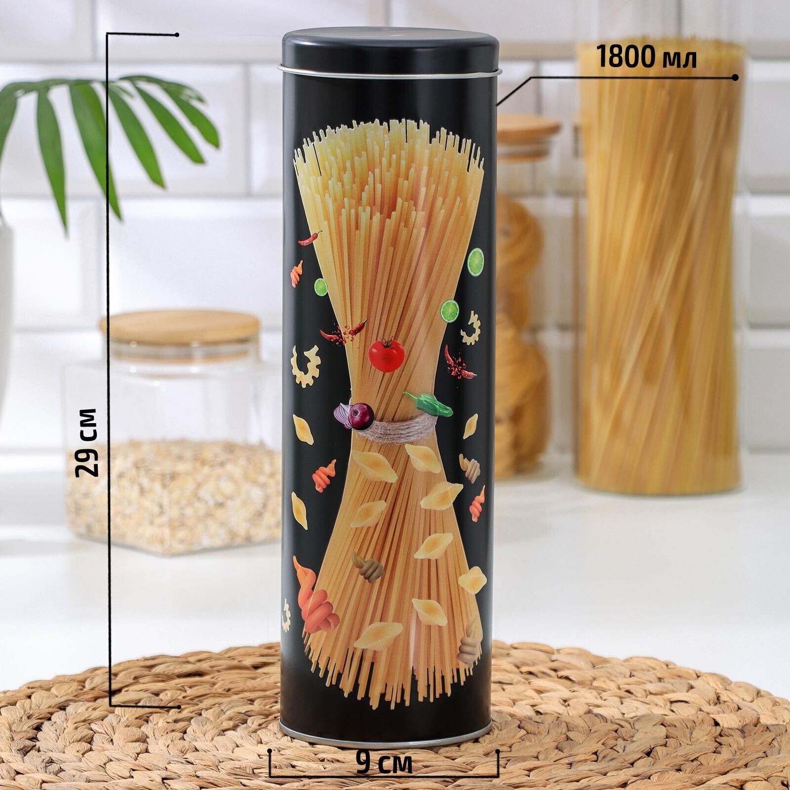 Банка удобна для хранения круп, специй, макаронных изделий, сахара, муки, бобовых.