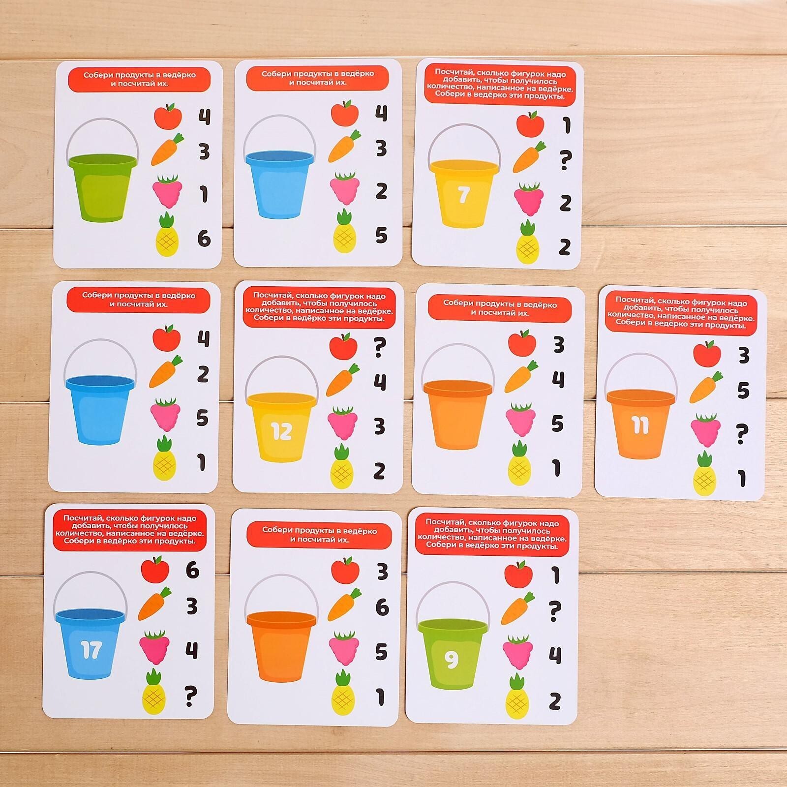 В комплект входит: 4 ведёрка, 24 пластиковые фишки и карточки с заданиями.