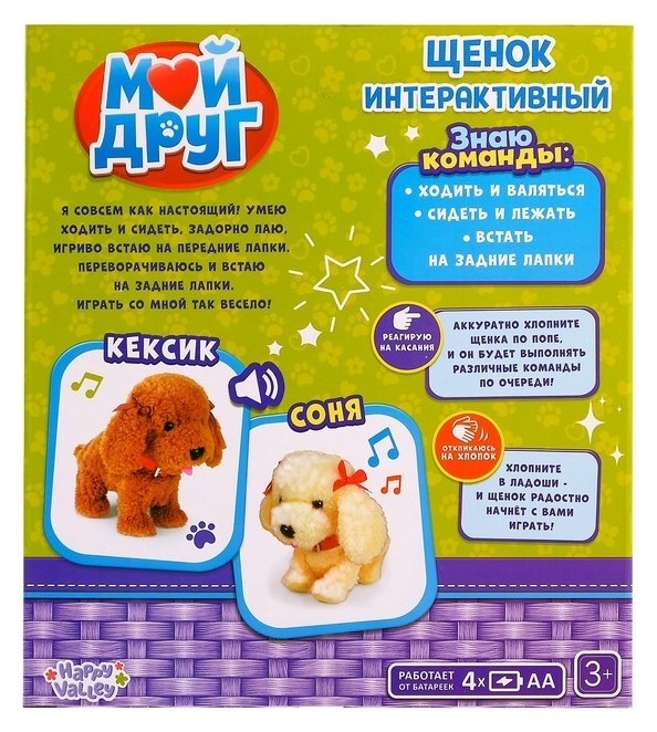 Интерактивная собака станет лучшим другом для вашего ребенка. Щенок выглядит как настоящий и выполняет все команды как дрессированный пёс: ходить, валяться, сидеть, лежать, встать на задние лапки. Игрушечный малыш умеет скулить и лаять, а также реагирует на касания. С таким питомцем ваш ребенок не соскучится, а для родителей решается проблема содержания четвероногого друга.