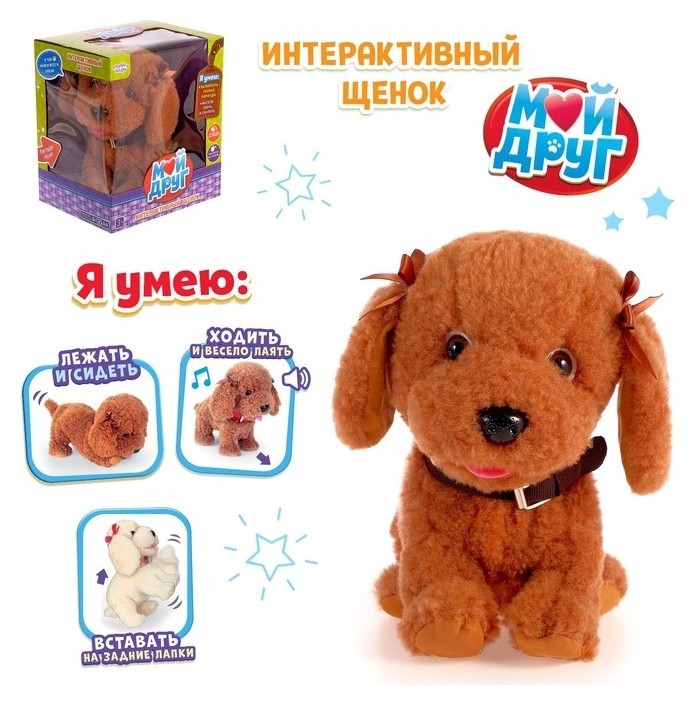 Интерактивная собака Мой друг выполняет команды реагирует на касания лает скулит ходит цвет коричневый