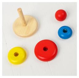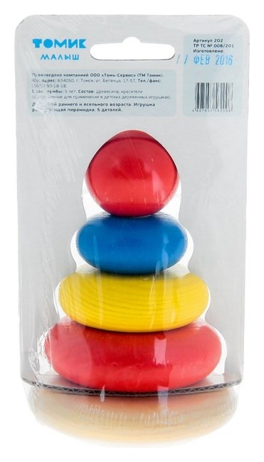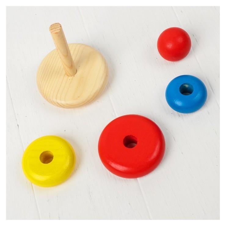 Пирамидка, 5 элементов рекомендована для игр малышей с полугода (и даже ранее). Пирамидка не только развивает координацию ребёнка и логическое мышление — детали с отверстиями учат малышей находить нужные элементы по подобию форм. С помощью пирамидки можно не только развлечь малыша, но и планомерно развивать его мышление, обучать основным цветам, понятиям «больше-меньше», «одинаковый-разный».