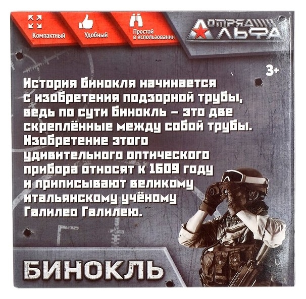 Настоящему агенту нужен качественный арсенал. Бинокль «Отряд альфа» создан компактным и удобным. Он прост в использовании и увеличивает изображение как настоящий бинокль!