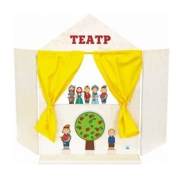 Под окошком расположена специальная зона, где ребенок сможет расставлять декорации. Наличие такой ширмы в совокупности с куклами-перчатками будет мотивировать малыша на постановку спектаклей, что позволит ему дать выход своему воображению и артистизму.