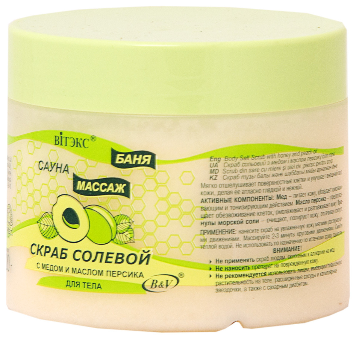 Натуральный солевой скраб для тела призван снять верхний ороговевший, начавший уже отшелушиваться, слой кожи и произвести глубокое очищение и питание кожи. Одним из компонентов скраба является мягкий абразивный материал – соль и питательная основа: масло персика и мед. Кристаллы соли снимают с поверхности кожи отмершие клетки, потожировые выделения и другие загрязнения, что помогает коже быстрее обновляться. После удаления отмерших клеток кожи, образуются новые, благодаря чему кожа становится более гладкой, нежной и бархатистой, улучшается кислородный обмен, кожа полируется и приобретает более здоровый сияющий вид, оттачивается желаемый силуэт.