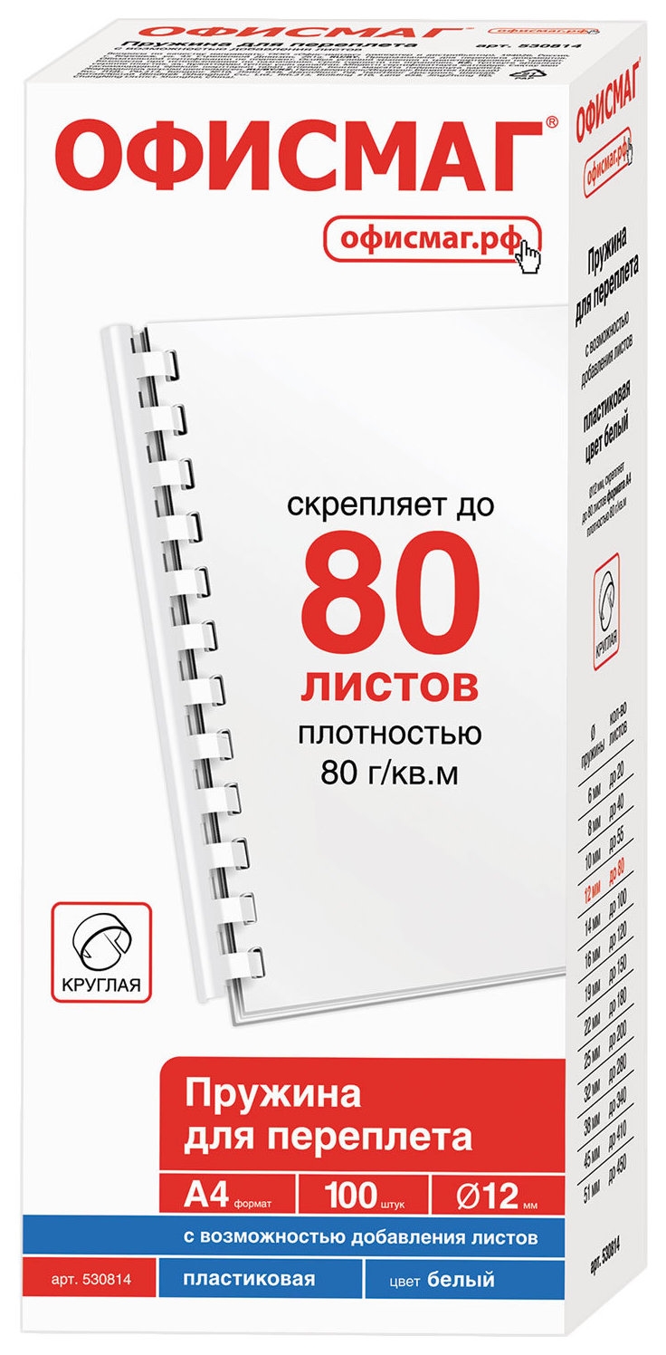 Пружины пластиковые для переплета, комплект 100 шт., 12 мм (для сшивания 56-80 листов), белые, Офисмаг