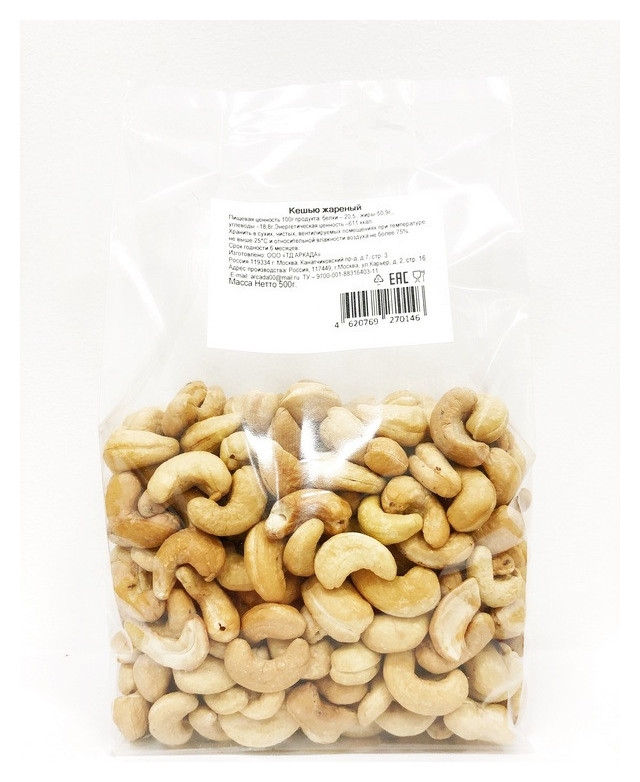 Кешью Аркада жареный 500 г. Продукт готов к употреблению. Кешью (он же индийский орех) очищенный, жаренный. Наряду с белками, жирами и углеводами содержит никотиновую и жирные кислоты, витамины групп E, B и A, клетчатку, железо, калий, цинк, фосфор, марганец, селен, антиоксиданты (фенольные соединения и фитостеролы). Такой набор компонентов делает орехи кешью чрезвычайно полезными. Их можно использовать для перекусов, класть в салаты и десерты. Допускается наличие в упаковке орехов со сколами (5-10% от всей массы), возникающими в результате переработки при чистке, сушки в промышленных барабанах, при фасовке и транспортировке и никак не влияющими на качество и вкус. Пищевая ценность на 100 г продукта: белки - 21.0 г, жиры - 48.0 г, углеводы - 15,7 г. Энергетическая ценность на 100 г продукта: 579 ккал. Срок годности: 9 месяцев. Хранить при температуре от +5°С до +21°С при относительной влажности не более 75%. Вес: 500 г. Страна производства: Россия.