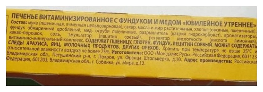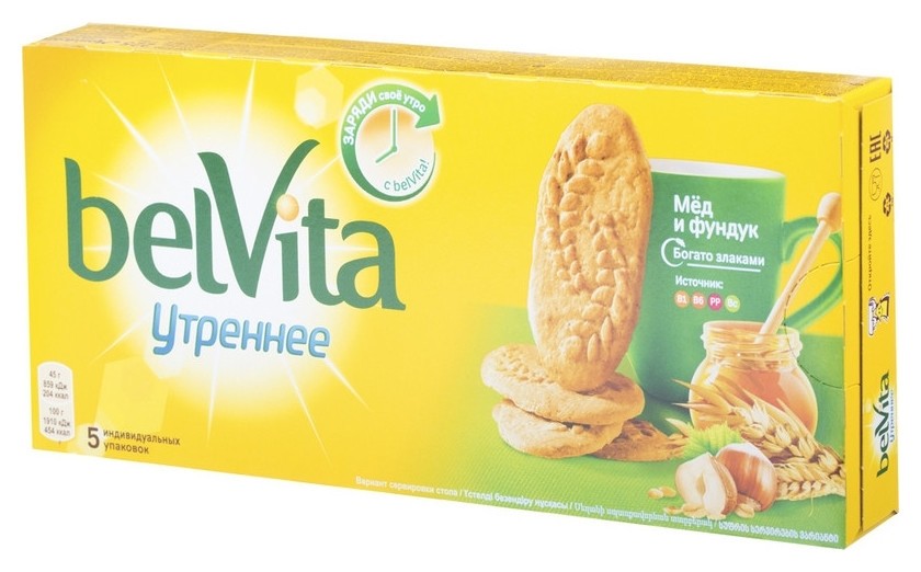 Печенье песочное Юбилейное BelVita Утреннее мед и фундук - это очень вкусное, хрустящее печенье, приготовленное специально для завтрака из отборных злаков. Благодаря особой технологии выпекания в этом печенье сохраняются медленные углеводы, которые усваиваются в течение 4 часов. В коробке 5 отдельных упаковок по 4 штуки. Состав: мука (пшеничная, ячменная цельнозерновая), сахар, масла и жир растительные, хлопья (овсяные, пшеничные), фундук обжаренный дробленый, мед, отруби пшеничные, разрыхлитель (натрия гидрокарбонат), ароматизаторы, какао-порошок, соль, эмульгатор (лецитин соевый), регулятор кислотности (кислота лимонная), витаминно-минеральный комплекс. Содержит пшеницу, глютен, фундук, лецитин соевый. Может содержать следы яиц, орехов, молочных продуктов. Противопоказано при индивидуальной непереносимости к белку молока и яичному белку. Пищевая ценность в 100 г продукта: белки - 7,7 г; жиры - 18 г; углеводы - 68,5 г. Витамины и минеральные вещества в 100 г продукта: В1 - 0,25 мг; В2 - 0,18 мг; В6 - 0,32 мг; РР - 3,4 мг; Вс - 0,03 мг; железо - 1,6 мг. Энергетическая ценность в 100 г продукта: 465 ккал. Срок годности: 9 месяцев. Условия хранения: при температуре до 25 °С и относительной влажности воздуха не более 75%. Масса нетто: 225 г. Тип упаковки: картонная. Страна производства: Россия.
