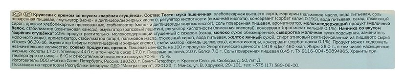 Круассан 7 days с кремом Какао 65 г промоупаковка, 3+1 штука - это 4 порции сладкой, вкусной и питательной выпечки с мягким вкусом вареной сгущенки, созданной для настоящего наслаждения в любой момент дня. Нежное, воздушное тесто в сочетании с такой начинкой не оставит равнодушным ни одного сладкоежку. Утренний или послеобеденный перерыв на чашечку кофе с ароматным круассаном подарит настоящее наслаждение и зарядит отличным настроением на весь день. Благодаря тому, что каждый круассан 7 days находится в отдельной упаковке, его всегда можно взять с собой, куда бы вы ни собрались. Он станет прекрасным помощником в утолении голода на работе, в школе, в долгой поездке и при активных прогулках с детьми. Это отличный снек, который удобно давать ребенку в школу и на дополнительные занятия. Удобная упаковка позволяет не переживать о его сохранности, а также не создает хлопот в переноске. Его можно смело класть в школьный портфель, рюкзак или сумку. Яркий пакет обеспечит его сохранность и чистоту. Легкий и невесомый, он не добавит тяжести даже маленькому детскому рюкзачку, зато подарит радостные эмоции во время его употребления. Круассан 7 days с вареной сгущенкой идеально сочетается с чаем и кофе, но не менее приятен в дополнение к сокам, воде или другим напиткам. Попробуйте яркую аппетитную выпечку, дарите себе и своим близким радостные мгновения каждый день! Упаковка из 4 штук станет оптимальным вариантом для дружных семейных моментов или угощения гостей. Состав: тесто: мука пшеничная х/п в/с, маргарин (пальмовое масло, вода питьевая, соль поваренная пищевая, эмульгатор (моно- и диглицериды жирных кислот), регулятор кислотности (лимонная кислота), консервант сорбат калия 0,1%), вода питьевая, сахар, глюкозный сироп, дрожжи хлебопекарные прессованные, стабилизатор (моно- и диглицериды жирных кислот), соль поваренная пищевая, ароматизатор, молокосодержащий продукт (молочный белок, стабилизатор (ксандовая камедь), эмульгатор (рапсовый лецитин ), регулятор кислотности (лимонная кислота),консервант (пропионат кальция 0,1%). Начинка со вкусом вареная сгущенка 23%: продукт растительно-молокосодержащий сгущенный с сахаром (сахар, молоко сухое обезжиренное, сыворотка молочная сухая подсырная, заменитель молочного жира), ароматизатор, стабилизатор (агар), пальмовое масло, глюкозный сироп, вода питьевая, желток яичный сухой, спирт этиловый ректификованный из пищевого сырья ?Люкс? 96,3% об, эмульгатор (эфиры полиглицерина и жирных кислот), стабилизатор (камедь целлюлозы), ароматизаторы, консервант (сорбат калия 0,1%). Продукт может содержать незначительное количество: соевых продуктов, орехов. Противопоказано при непереносимости к белку молока. Вес: 260 г. Тип упаковки: пакет. Страна производства: Россия. Срок хранения: 150 дней. ТУ 9136-006-50894965-2004.