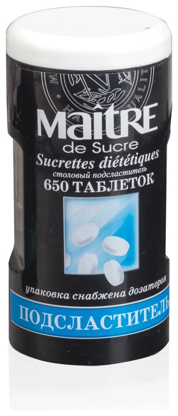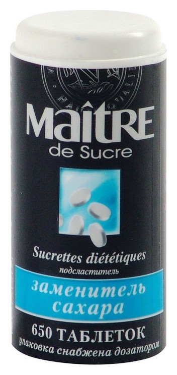 Основой сахарозаменителя Maitre de Sucre являются сахарин и цикламат. Предназначен для добавления в напитки и блюда, подходит для диетического питания. Каждая из 650 таблеток заменяет одну чайную ложку сахара (5 гр.). Пластиковая упаковка снабжена дозатором. Условия хранения: Хранить в сухом прохладном месте Производитель: ООО Инновационные продукты