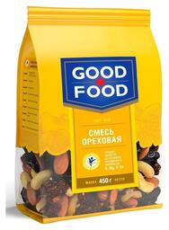 Смесь из сушеных ягод и орехов фасованная: смесь ореховая. Состав: изюм (виноград сушеный без косточки, подсолнечное масло, консервант Е220), сушеные ядра миндаля, фундука, кешью, бразильского ореха в изменяемых соотношениях. Пищевая ценность на 100г продукта: белки - 10,5г, жиры - 38,7г, углеводы - 36,5г, пищевые волокна - 7г. Энергетическая ценность: 543,9 ккал. Продукт является источником витаминов и минералов E, Mg, P, Fe. Продукт противопоказан при индивидуальной непереносимости орехов, может содержать фрагменты скорлупы орехов, следы арахиса, кунжута и других орехов. Хранить при температуре от +5 до +25?С и относительной влажности воздуха не более 75%.