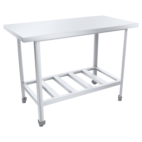 Столешница изготавливается из нержавеющей стали и дополнительно усиливается ЛДСП. Столы оснащаются полками-решетками или опционально сплошными полками из оцинкованной или нержавеющей стали, которые устанавливаются поверх полки-решетки. Ножки оснащаются винтовыми опорами, позволяющими регулировать высоту стола. Упаковка гофрокартон.