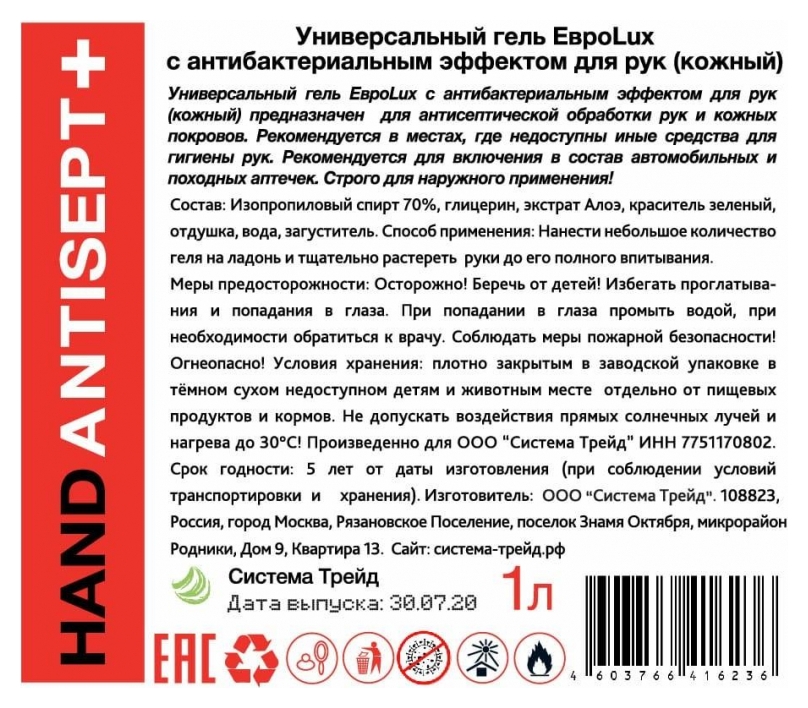 Антисептик кожный гель ЕвроLux антибактериальный спиртовой 1 л. Химический состав средства: спирты, вспомогательные компоненты. Действующие вещества: изопропиловый спирт 70 %, глицерин 10%, отдушка 0.1%, загуститель 0.3, краситель 0.5%, вода. Сфера применения: ЛПУ, в быту населением. Объекты обработки: гигиеническая обработка рук. Страна производства: Россия.
