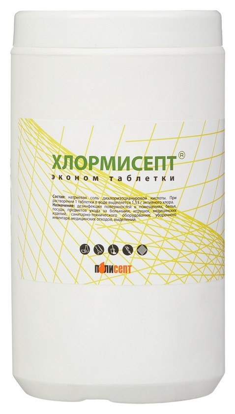 Форма выпуска: таблетки №300.Назначение: средство предназначено для дезинфекции поверхностей в помещениях, жесткой мебели, санитарно-технического оборудования, изделий медицинского назначения (из коррозионностойких металлов, резин, пластмасс, стекла), белья, посуды, в том числе лабораторной (включая однократного использования), предметов ухода за больными, уборочного инвентаря, медицинских отходов (ватные тампоны, перевязочные средства, изделия медицинского назначения однократного применения и др.), игрушек, обуви из резин, пластмасс и других полимерных материалов, резиновых ковриков; мусороуборочного оборудования и мусоросборников; крови, сыворотки и других биологических жидкостей (мочи, фекалий, мокроты, ликвора), при инфекциях бактериальной (включая туберкулез, внутрибольничные, особо опасные инфекции: холера, чума, туляремия, сибирская язва), вирусной и грибковой (кандидозы, дерматофитии) этиологии при проведении профилактической, текущей и заключительной дезинфекции в лечебно-профилактических учреждениях (ЛПУ), включая акушерские стационары (кроме отделений неонатологии), клинических, микробиологических и др. лабораториях, в инфекционных очагах, на санитарном транспорте; при проведении профилактической дезинфекции на автотранспорте для перевозки пищевых продуктов, на предприятиях коммунально-бытового обслуживания (гостиницы, общежития, парикмахерские, массажные и косметические салоны, сауны, салоны красоты, бани, прачечные, предприятия общественного питания, промышленные рынки, общественные туалеты), учреждений образования, культуры, отдыха, спорта (бассейны, санпропускники, культурно-оздоровительные комплексы, офисы, спорткомплексы, кинотеатры и др. объекты в сфере обслуживания населения), в учреждениях пенитенциарных, детских и социального обеспечения; для проведения генеральных уборок.Применение: поверхности в помещениях (пол, стены и др.), жесткую мебель протирают ветошью, смоченной в растворе средства из расчета 100 мл/м2, или орошают из расчета 300 мл/м2 при использовании гидропульта, или 150 мл на мл/м2 - при использовании распылителя типа ?Квазар?. Сильно загрязненные поверхности обрабатывают дважды. После дезинфекции помещение проветривают до исчезновения запаха хлора.