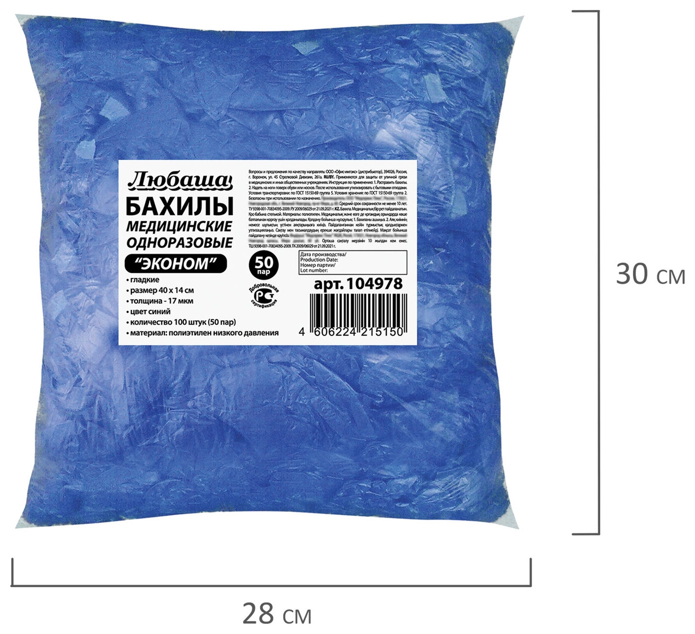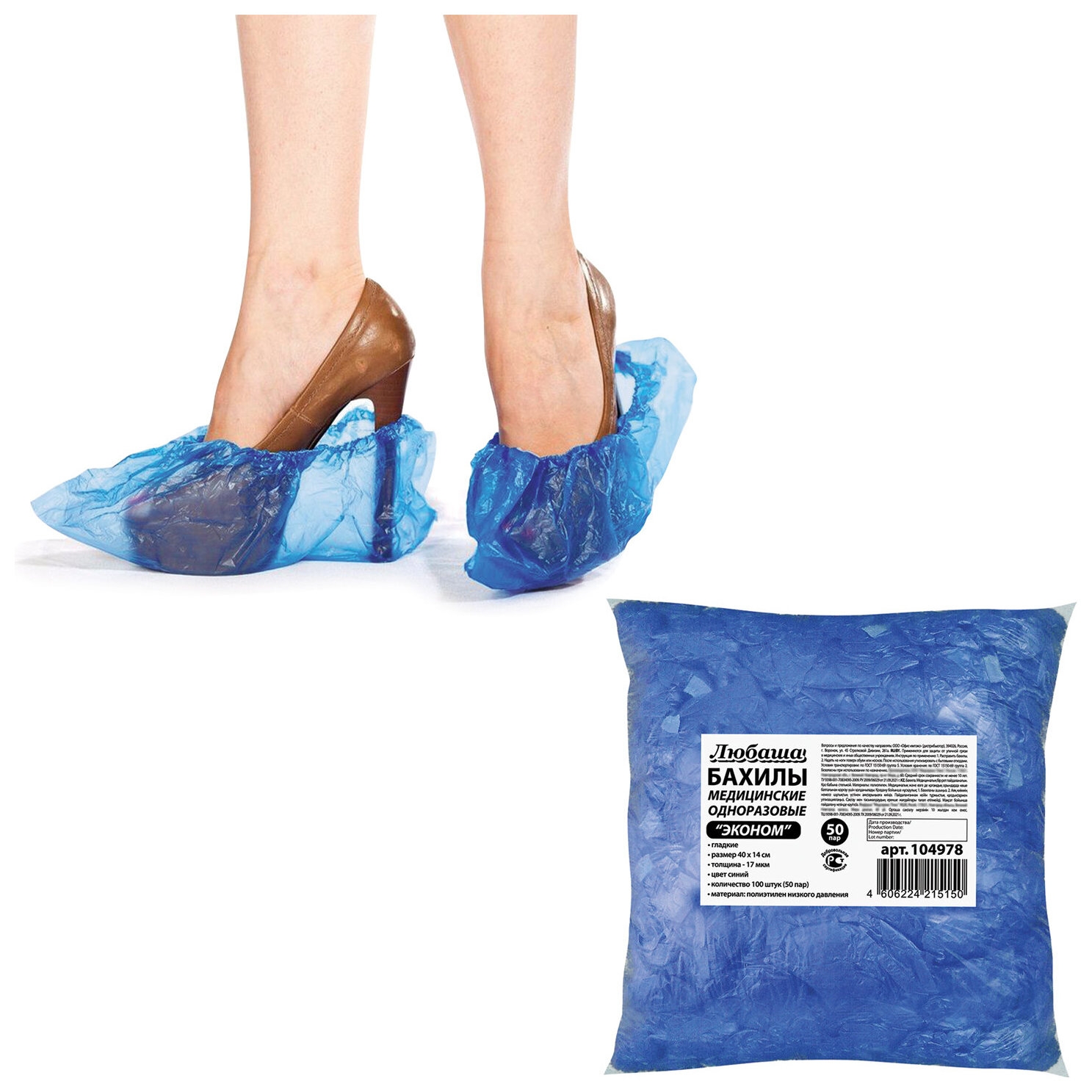 Бахилы комплект 100 штук (50 пар) в упаковке, эконом, размер 40х14 см, 1,8 г, пнд, любаша, 104978