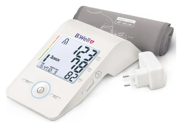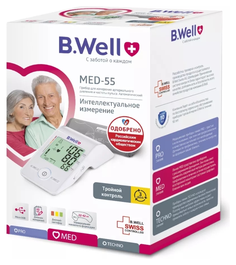 Тонометр MED-55 + адаптер, универсальная манжета 22-42 см, тройное измерение 3Check, дисплей-светофор, Micro USB разъем питания
