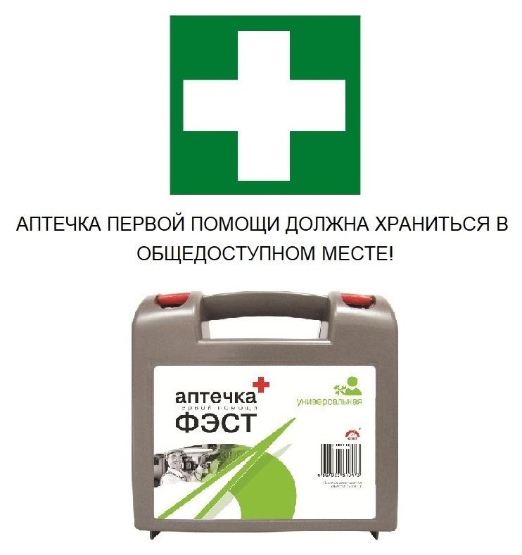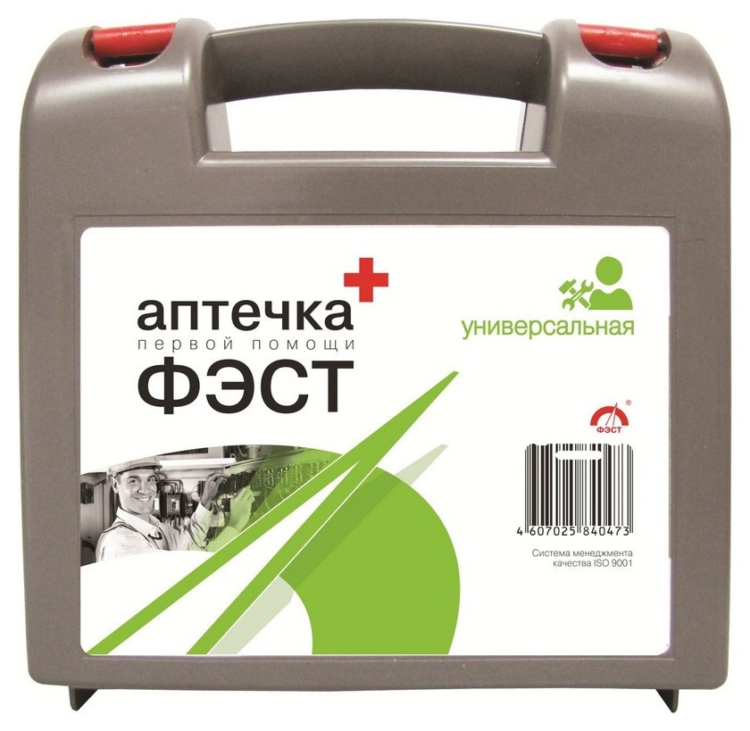 Аптечка ?ФЭСТ? универсальная используется для оказания первой неотложной помощи в экстренной ситуации на производстве. Рассчитана на 7 человек. Аптечка содержит обезболивающие средства, дезинфицирующие вещества и перевязочные материалы. Упакована в пластиковый футляр в форме чемодана с защелкивающимися клипсами. Размер - 21x21x7,5 см. Срок годности - 18 месяцев с даты упаковывания. № Содержание универсальной аптечки ?ФЭСТ? Кол-во: 1. Анальгин, табл. 0,5 № 10 1 уп. 2. Валидол, табл. 0,06 № 6 1 уп. 3. Уголь активированный, табл. 0,25 № 10 2 уп. 4. Бинт стерильный 5 м х 10 см или 5 м x 7 см 1 шт. 5. Бинт нестерильный 5 м х 10 см 1 шт. 6. Бинт нестерильный 5 м х 5 см 1 шт. 7. Бинт эластичный трубчатый медицинский нестерильный № 1, 3, 6 по 1 шт. 8. Вата, 50 г 1 уп. 9. Бриллиантового зеленого раствор 1%, 10 мл 1 фл. 10. Аммиака раствор 10%, 10 мл 1 фл. 11. Экстракт валерианы, табл. 0,02 № 10 1 уп. 12. Лейкопластырь бактерицидный 1,9x7,2 см 4 уп. 13. Жгут кровоостанавливающий 1 шт. 14. Гипотермический (охлаждающий) пакет 1 шт. 15. Стаканчик для приема лекарств 1 шт. 16. Перекиси водорода раствор 3%, 40 мл 1 фл. 17. Салфетки марлевые медицинские стерильные 16x14 см, № 20 1 уп. 18. Тетрациклиновая мазь 3%, 15 г 1 уп. Срок годности: 18 месяцев. Общие правила и рекомендации эксплуатации аптечек первой помощи: 1. Выделите общедоступное место для хранения аптечки, отметьте информационным знаком ?Аптечка?. 2. Регулярно напоминайте сотрудникам о наличии аптечки (1 раз в месяц или в 1 раз в квартал - в зависимости от специфики производства). 3. У секретаря, руководителя или в самой аптечке должна быть информация о сотрудниках с медицинским образованием и их контактные номера. 4. Регулярно проводите инвентаризацию аптечки на предмет наличия всех лекарств и их сроков годности. 5. Проверьте, чтобы лекарства в аптечке соответствовали типовым травмам рода деятельности предприятия. 6. Дополните аптечку лекарствами специфичных заболеваний (диабет, астма, аллергия и др.) 7. Наличие тонометра и термометра позволит быстрее определить какое лекарство необходимо дать сотруднику в ряде случаев. 8. Важно иметь контакты родственников или друзей, с кем можно связаться в случае критической ситуации. 9. Составьте подробную инструкцию с перечнем симптомов и лекарств. Разместите информационные плакаты. Это позволит не терять ценное время при оказании первой помощи.