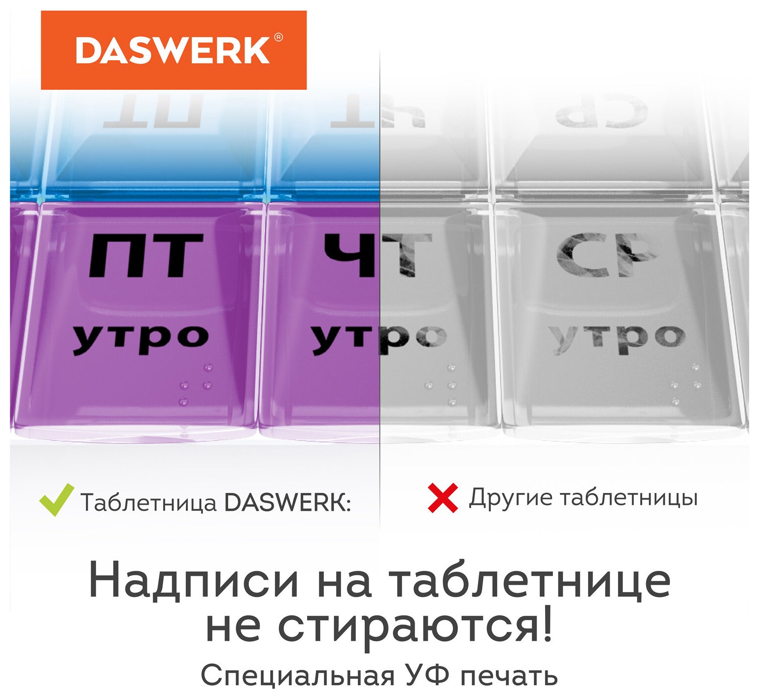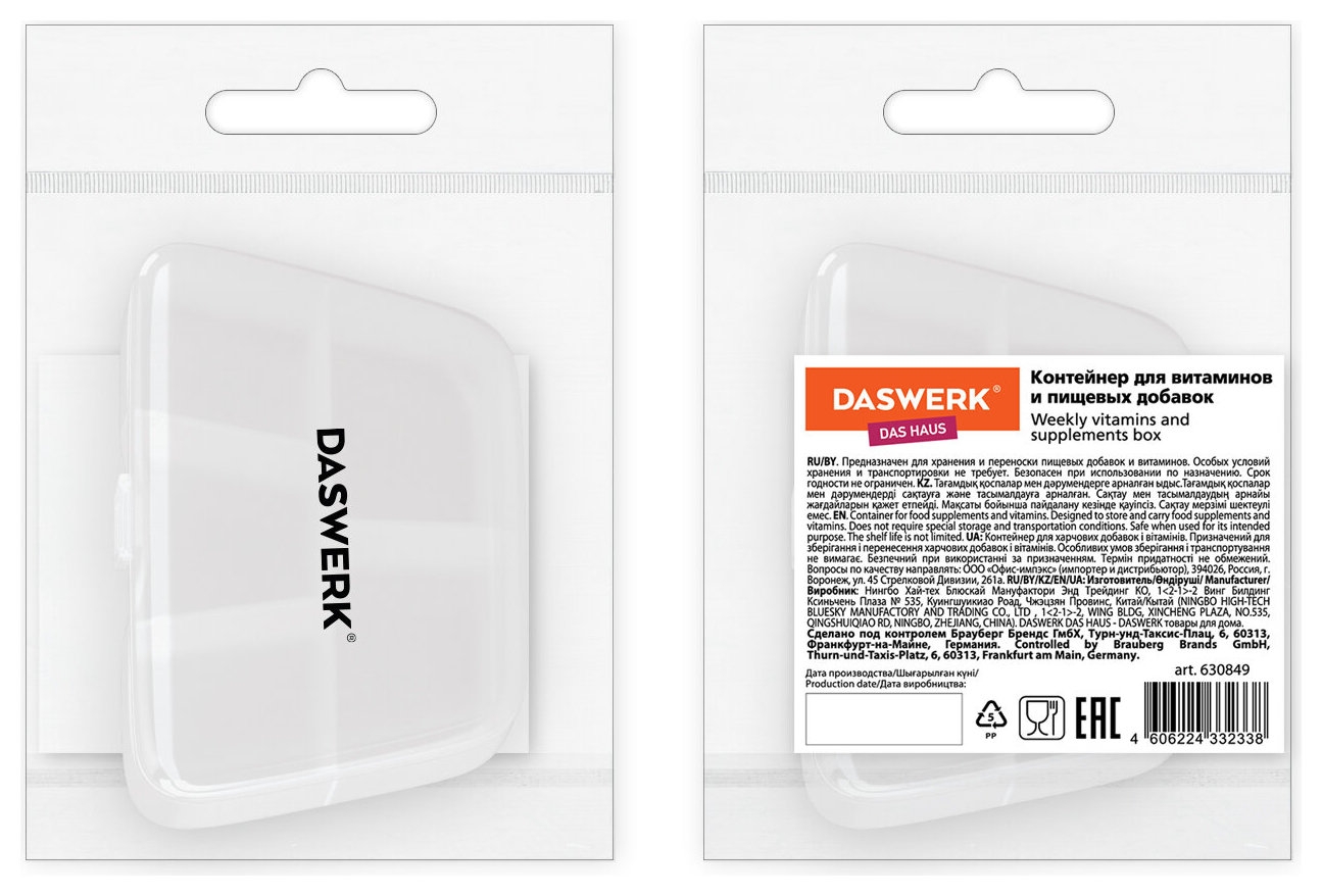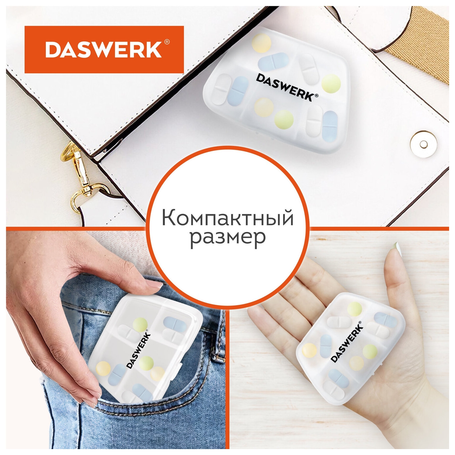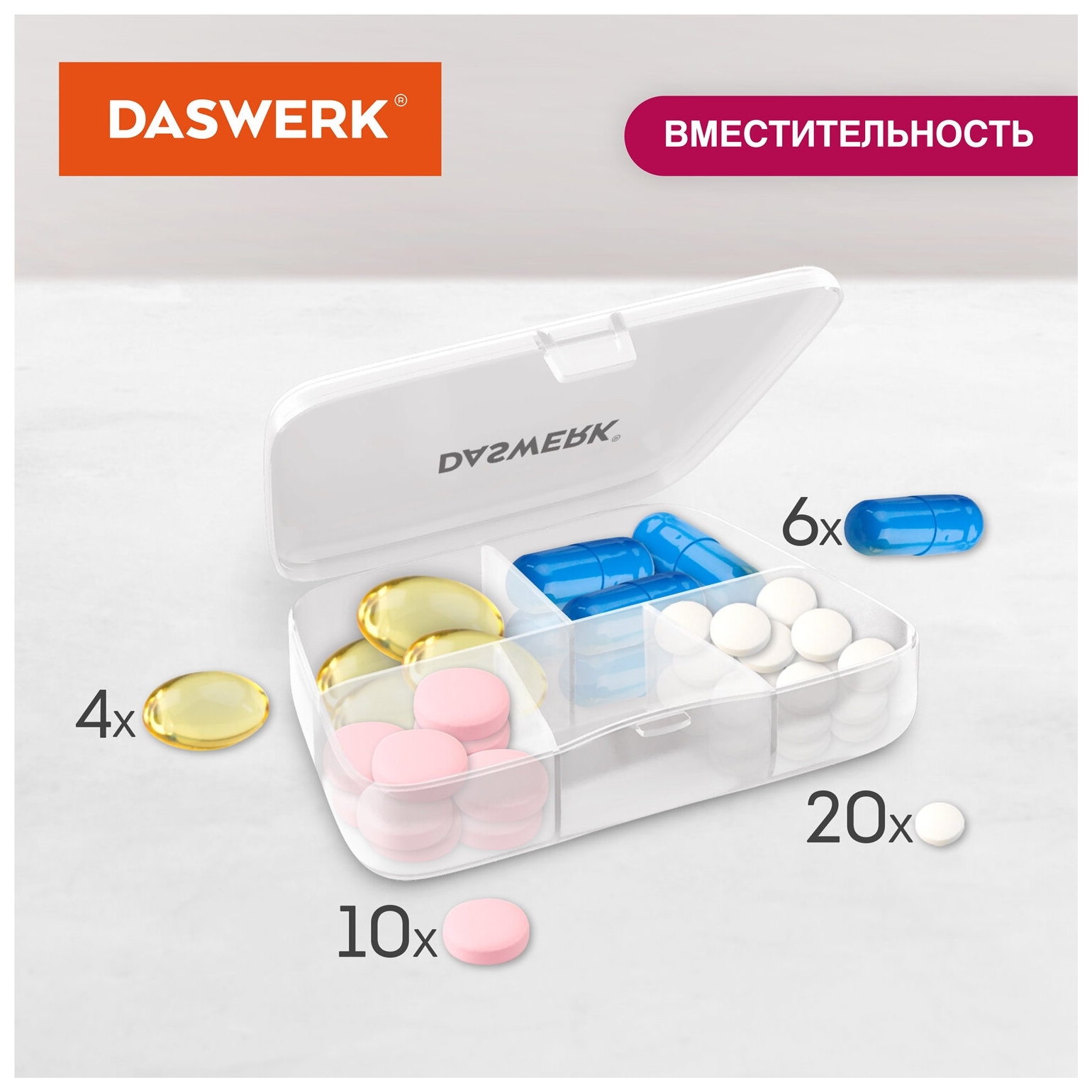 Таблетница DASWERK предназначена для надежного хранения лекарств, витаминов и пищевых добавок. Контейнер из легкого и прочного пластика гарантирует удобство и безопасность в использовании.
