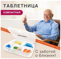 Таблетница представляет собой прозрачный пластиковый контейнер с 5 отсеками, достаточно вместительными для хранения ежедневного приема лекарств. Крышка контейнера плотно и надежно защелкивается, предотвращая рассыпание содержимого. Прозрачный дизайн позволяет без труда контролировать прием лекарственных средств. Благодаря своим компактным размерам, таблетница легко поместится в сумку, карман или даже кошелек. Удобное хранение и упорядоченный прием лекарств теперь доступен дома, на работе и в поездке. Перед первым использованием рекомендуется промыть контейнер теплой водой с мылом и тщательно высушить.