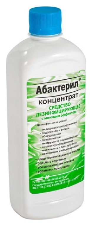 Дезинфицирующее средство ?Абактерил? 500 мл (концентрат). Химический состав дезсредства: ЧАС, третичный амин, гуанидин, поверхностно-активные вещества (ПАВ). Действующие вещества: N,N-бис(3-аминопропил)додециламин 1.6 %, алкилдиметилбензиламмоний хлорид (АДБАХ) 3 %, алкилдиметилэтилбензиламмоний хлорид 3 %, полигексаметиленбигуанидин гидрохлорид 1.4 %, ПАВы. Сфера применения: ЛПУ, клинические лаборатории, бактериологические лаборатории, детские учреждения (детсады, школы и т.п.), пенитенциарные учреждения, инфекционные очаги, предприятия общественного питания, предприятия продовольственной торговли, потребительские рынки, коммунальные объекты (бани, бассейны, гостиницы, общественные туалеты и т.п.), парикмахерские, косметические и (или) массажные салоны, прачечные, санитарный транспорт, отделения неонатологии, в быту населением, предприятия фармацевтической промышленности, аэропорты, вокзалы, объекты курортологии, диагностические лаборатории, вирусологические лаборатории, лаборатории пцр, морги и ритуальные учреждения. Объекты обработки: анестезиологическое оборудование, аптечная посуда, баки накопительные автономных туалетов, белье нательное, белье постельное, бытовые кондиционеры, вентиляционные фильтры, воздух в помещениях, воздуховоды, вращающиеся стоматологические инструменты, выделения больного (моча, фекалии, мокрота), гибкие эндоскопы, датчики диагностического оборудования (узи и т.д.), донорская кровь и препараты крови с истекшим сроком годности, жесткая мебель, жесткие эндоскопы, заполнение дезбарьеров, дезматов, дезковриков, игрушки, ИМН из металлов, резин на основе натурального и силиконового каучука, стекла, пластмасс, ИМН обычные, ИМН одноразовые перед утилизацией, инструменты к эндоскопам, инструменты парикмахерских, массажных, косметических салонов, инструменты стоматологические, инструменты хирургические, кровь, крышные кондиционеры, кувезы, лабораторная посуда, мед. отходы из текстильных материалов (ватные и марлевые тампоны, марля, бинты), мокрота, моча, мусоросборочное оборудование, мусоропроводы, мягкая мебель, напольные покрытия, наркозно-дыхательная аппаратура, ножи, разделочные доски, разделочные столы, тара, обивочные ткани, обувь из кожи, тканей, кожезаменителей, обувь из пластика, резины, одноразовая посуда, пищевые отходы, пиявки медицинские, плевательницы, поверхности в помещениях, поверхности приборов и аппаратов, посуда из-под выделений, почва, предметы для мытья посуды, предметы личной гигиены, предметы обстановки, предметы ухода за больными, приспособления к кювезам, раковины, ванны (фарфоровые, эмалированные, акриловые), рвотные массы, резиновые и полипропиленовые коврики, санитарно-техническое оборудование, санитарный транспорт, системы вентиляции и кондиционирования воздуха, слюноотсосы, смывные воды, спецодежда, сплит-системы, мультизональные сплит-системы, спортивный инвентарь, столовая посуда, стоматологические материалы (оттиски из альгината, силикона, полиэфирной смолы, зубопротезные заготовки, артикуляторы), стоматологические отсасывающие системы, транспорт для перевозки пищевых продуктов , уборочный инвентарь, фекалии, эндоскопические смывные воды. Класс опасности: при введении в желудок - 3; при нанесении на кожу - 4; рабочего раствора - 4. Активно в отношении: - бактерии (Mycob