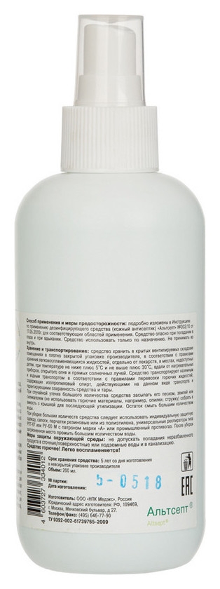 Антисептик кожный спрей ?Альтсепт? спиртовой 200 мл. Химический состав средства: гуанидин, спирты, вспомогательные компоненты. Действующие вещества: N-пропанол (пропанол-1) 20 %, изопропиловый спирт (пропанол-2) 50 %, компоненты, улучающие состояние кожи, хлоргексидина биглюконат 0.5 %, вспомогательные компоненты. Сфера применения: ЛПУ, клинические лаборатории, станции переливания крови, бактериологические лаборатории, детские учреждения (детсады, школы и т.п.), Предприятия общественного питания, предприятия продовольственной торговли, Коммунальные объекты (бани, бассейны, гостиницы, общественные туалеты и т.п.), учреждения соцобеспечения, парикмахерские, косметические и массажные салоны, санитарный транспорт, в быту населением, аптеки, вирусологические лаборатории. Объекты обработки: гигиеническая обработка рук, обработка инъекционного поля, обработка локтевых сгибов доноров, обработка операционного поля, обработка рук операционных медицинских сестер, акушерок и других лиц, участвующих в операциях и приеме родов, обработка рук хирургов, поверхности в помещениях, поверхности приборов и аппаратов. Класс опасности: при введении в желудок - 4; при нанесении на кожу - 4; рабочего раствора - 4. Активно в отношении: бактерии (Mycobacterium tuberculosi, возбудители ВБИ, грамотрицательные бактерии, грамположительные бактерии), вирусы (грипп, парагрипп, прочие возбудители ОРВИ), патогенные грибы (дерматофитон, кандида). Срок годности: 5 лет. Страна производства: Россия.