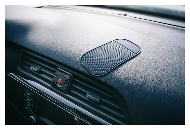 Противоскользящий коврик на приборную панель выполнен из легко моющегося и мягкого материала. Изделие плотно держится на любом покрытии приборной панели, а так же защищает её от повреждений. Аксессуар надёжно удерживает предметы при резких манёврах и поворотах.